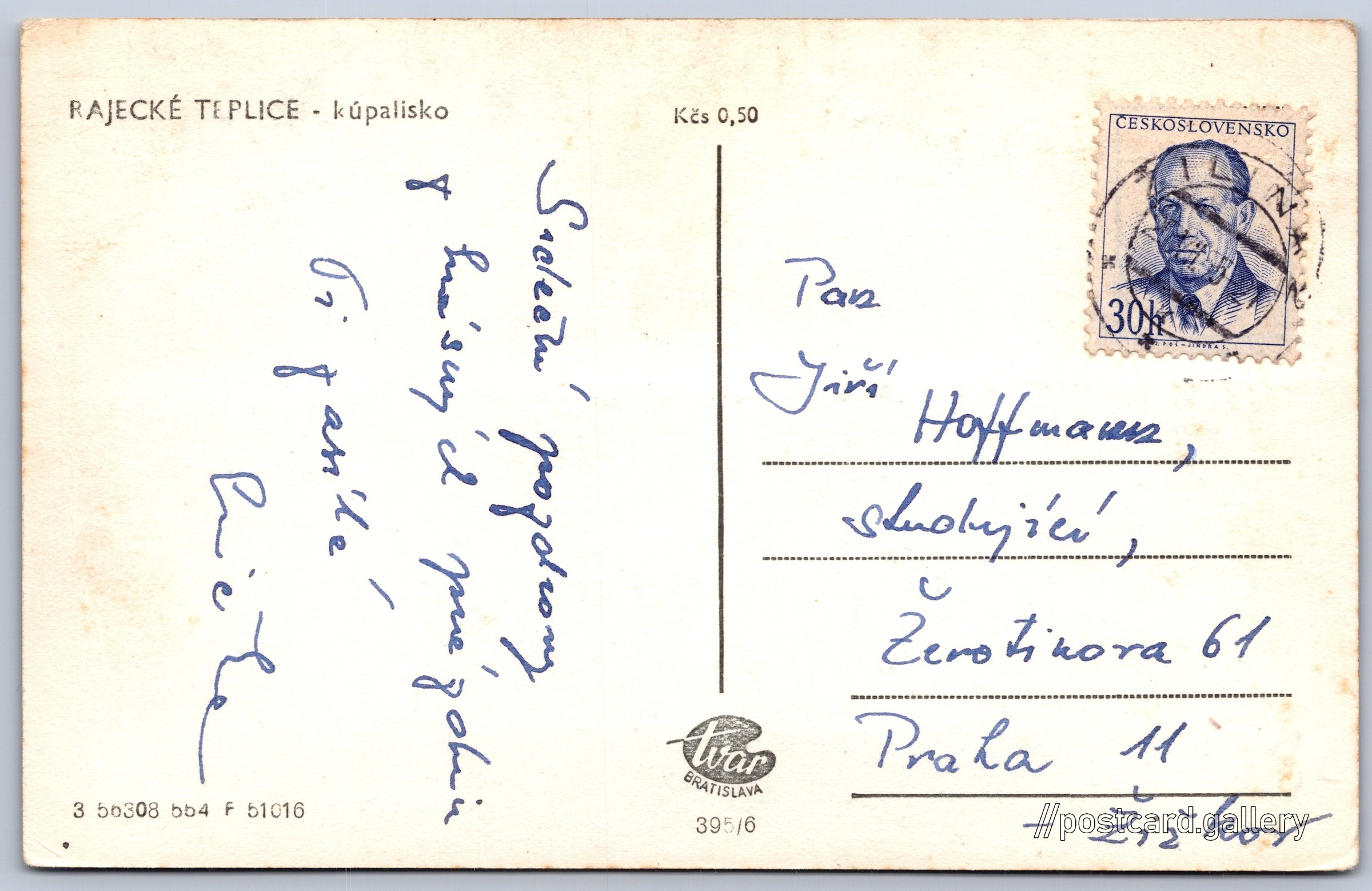 Rajecké Teplice, swimming pool Pokud chcete vidět pohlednice ve vyšším rozlišení nebo zobrazovat jejich zadní stranu, tak se prosím nejdříve přihlašte Log in Register RAJECKÉ TEPLICE - kúpalisko Language of printed text on postcard: Slovak Kúpalisko Laura Rajecké Teplice, Rajecké Teplice, Slovensko show on map 12 other postcards can be found in the immediate vicinity of the place shown on the postcard Show near postcards Publisher: Tvar Bratislava (Czechoslovakia) Issue year of postcard: May, 1954 Postcard size (w x h) and shape: 136 x 86 mm (5.35" x 3.39"), rectangle Used postcard:Stamp date: 25.7.1955 Prices: Postcard price: 0,50 Kčs (CSK)Paid stamps: 0,30 Kčs (CSK) Postcard codes: 3 56308 554 F 51016 395/6 DiscussionAdd post Add new folder ... Manage folders ...
