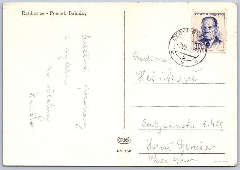 Ratibořice, Grandmother's Memorial Pokud chcete vidět pohlednice ve vyšším rozlišení nebo zobrazovat jejich zadní stranu, tak se prosím nejdříve přihlašte Log in Register Ratibořice Pomník Babičky Language of printed text on postcard: Czech Pomník Babička s dětmi, Pomník, památník, Česká Skalice - Ratibořice, Česko show on map 17 other postcards can be found in the immediate vicinity of the place shown on the postcard Show near postcards Publisher: Nakladatelství Orbis (Czechoslovakia) Issue date of postcard is not known Help us estimate date of postcard publishing Postcard size (w x h) and shape: 146 x 102 mm (5.75" x 4.02"), rectangle Used postcard Prices: Postcard price: 3,50 Kčs (CSK)Paid stamps: 0,30 Kčs (CSK) DiscussionAdd post Add new folder ... Manage folders ...