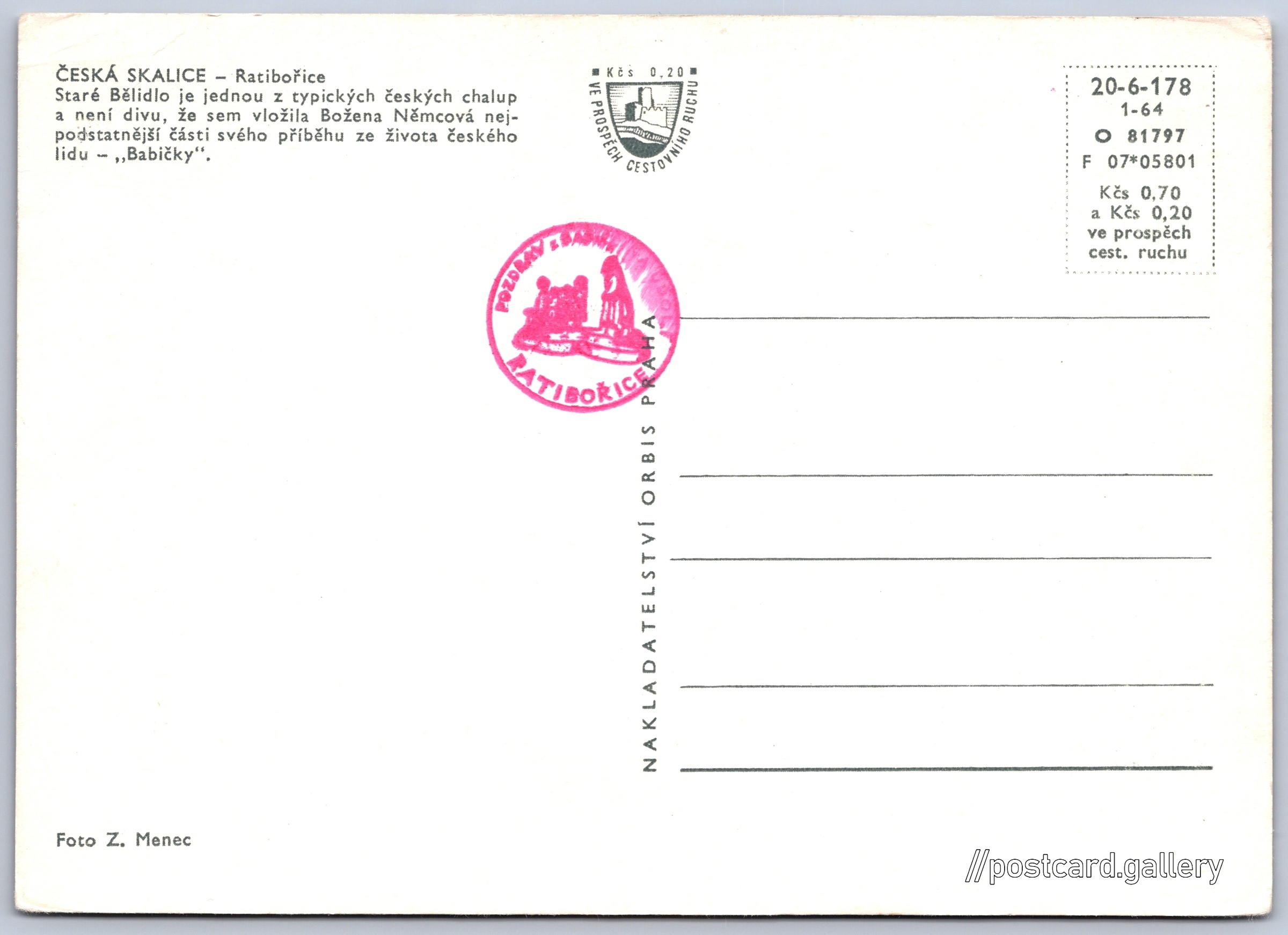 Ratibořice, Staré bělidlo Pokud chcete vidět pohlednice ve vyšším rozlišení nebo zobrazovat jejich zadní stranu, tak se prosím nejdříve přihlašte Log in Register ČESKÁ SKALICE - RatibořiceStaré Bělidlo je jednou z typických českých chalup a není divu, že sem vložila Božena Němcová nejpodstatnější části svého příběhu ze života českého lidu - "Babičky". Language of printed text on postcard: Czech Staré Bělidlo, Lidová architektura, Ratibořice 17, Česká Skalice - Ratibořice, Česko show on map 17 other postcards can be found in the immediate vicinity of the place shown on the postcard Show near postcards Publisher: Nakladatelství Orbis (Czechoslovakia) Issue year of postcard: January, 1964 Postcard size (w x h) and shape: 151 x 109 mm (5.94" x 4.29"), rectangle Persons connected with this postcard: Zdeněk Menec(Photo author) Božena Němcová(Content of postcard) Unused postcard Prices: Postcard price: 0,70 Kčs (CSK) (+0,20 Kčs fee to support tourism) Postcard codes: 20-6-178 1-64 O 81797 F 07*05801 DiscussionAdd post Add new folder ... Manage folders ...