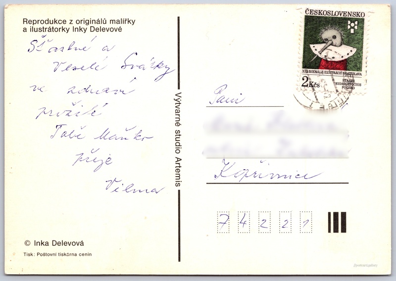 Reproduction of Inka Deleva's painting Pokud chcete vidět pohlednice ve vyšším rozlišení nebo zobrazovat jejich zadní stranu, tak se prosím nejdříve přihlašte Log in Register Reprodukce z originálů malířky a ilustrátorky Inky Delevové Language of printed text on postcard: Czech Publisher: Výtvarné Studio Artemis (Czechoslovakia) Estimated issue date of postcard: 1990 - 1992 Help us specify date of postcard publishing Postcard size (w x h) and shape: 148 x 104 mm (5.83" x 4.09"), rectangle Persons connected with this postcard: Inka Delevová(Artwork author) Used postcard Prices: Paid stamps: 2,00 Kčs (CSK) DiscussionAdd post Add new folder ... Manage folders ...