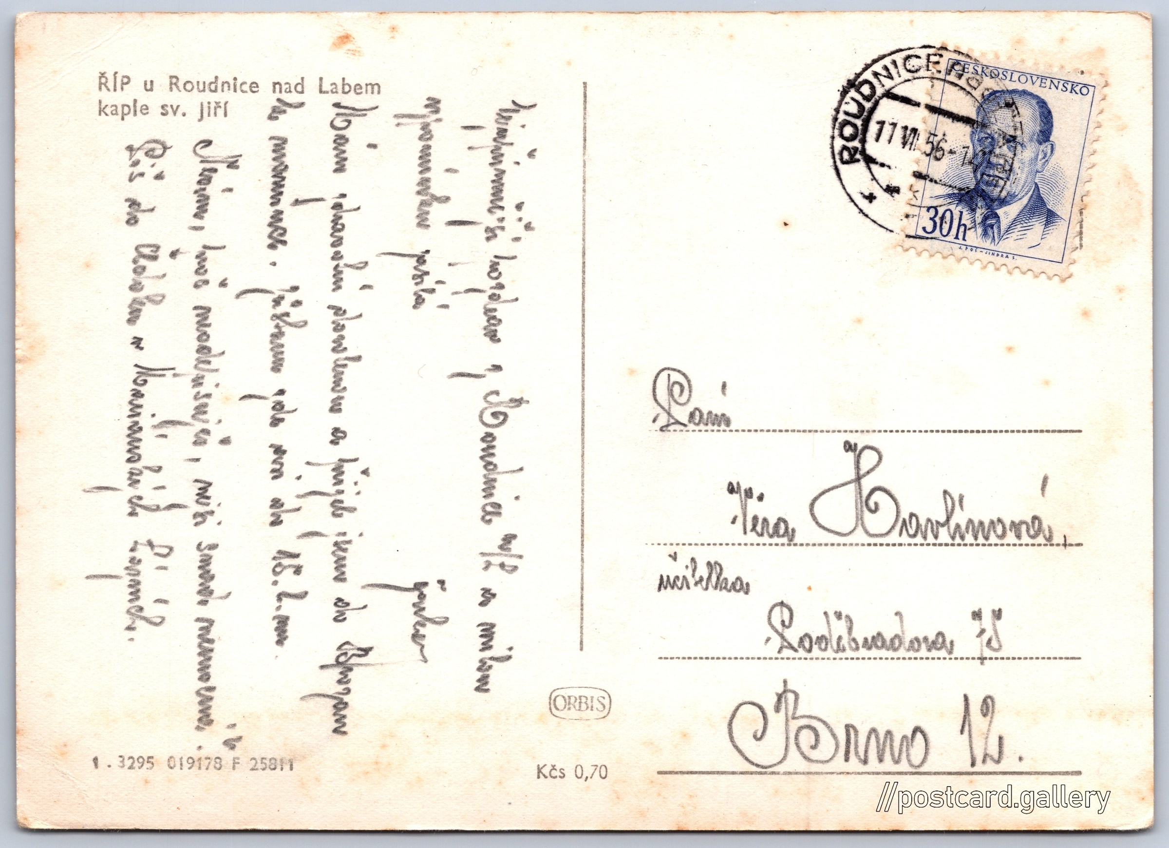 Říp, Chapel of St. George Pokud chcete vidět pohlednice ve vyšším rozlišení nebo zobrazovat jejich zadní stranu, tak se prosím nejdříve přihlašte Log in Register ŘÍP u Roudnice nad Labemkaple sv. Jiří Language of printed text on postcard: English Mnetěš 125, 413 01 Mnetěš, Czechia show on map 5 other postcards can be found in the immediate vicinity of the place shown on the postcard Show near postcards Publisher: Nakladatelství Orbis (Czechoslovakia) Estimated issue date of postcard: 1953 - 1956 Help us specify date of postcard publishing Postcard size (w x h) and shape: 145 x 104 mm (5.71" x 4.09"), rectangle Used postcard:Stamp date: 11.7.1956 Prices: Postcard price: 0,70 Kčs (CSK)Paid stamps: 0,30 Kčs (CSK) Postcard codes: 1-3295 019178 F 25811 DiscussionAdd post Add new folder ... Manage folders ...