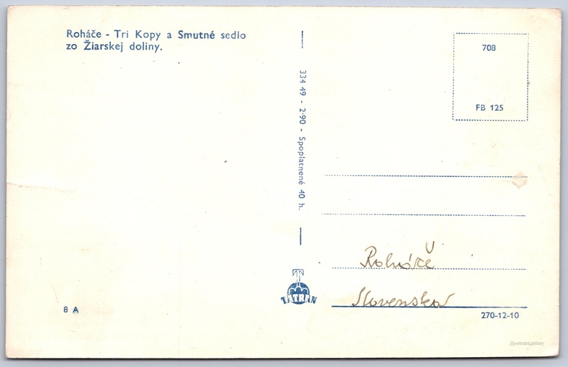 Roháče, Tri kopy Pokud chcete vidět pohlednice ve vyšším rozlišení nebo zobrazovat jejich zadní stranu, tak se prosím nejdříve přihlašte Log in Register Roháče - Tri Kopy a Smutné sedlo zo Žiarskej doliny. Language of printed text on postcard: Slovak Tri kopy (2136 m), Hora, výškový bod, Žiar, Okres Liptovský Mikuláš, Žilinský kraj, Slovensko show on map 13 other postcards can be found in the immediate vicinity of the place shown on the postcard Show near postcards Publisher: Tatran (Czechoslovakia) Issue year of postcard: 1949 Postcard size (w x h) and shape: 140 x 90 mm (5.51" x 3.54"), rectangle Unused postcard Prices: Postcard price: 2,90 Kčs (CSK) (+0,40 Kčs fee to support tourism) Postcard codes: 8 A 334 49 708 FB 125 270-12-10 DiscussionAdd post Add new folder ... Manage folders ...