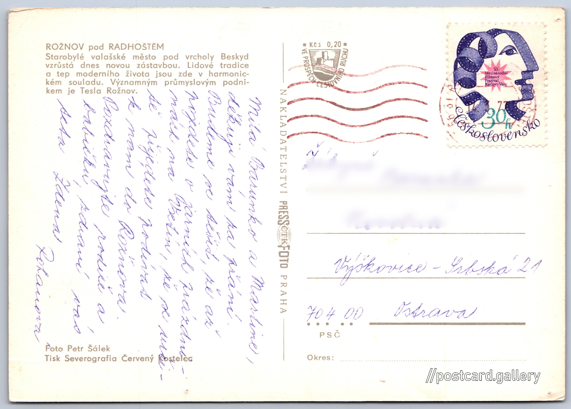 Rožnov pod Radhoštěm Pokud chcete vidět pohlednice ve vyšším rozlišení nebo zobrazovat jejich zadní stranu, tak se prosím nejdříve přihlašte Log in Register Rožnov pod Radhoštěm ROŽNOV pod RADHOŠTĚMStarobylé valašské město pod vrcholy Beskyd vzrůstá dnes novou zástavbou. Lidové tradice a tep moderního života jsou zde v harmonickém souladu. Významným průmyslovým podnikem je Tesla Rožnov. Language of printed text on postcard: Czech Rožnov pod Radhoštěm, Město, Česko show on map Publisher: PressFoto Praha (Czechoslovakia) Estimated issue date of postcard: 1974 - 1977 Help us specify date of postcard publishing Postcard size (w x h) and shape: 148 x 105 mm (5.83" x 4.13"), rectangle Persons connected with this postcard: Petr Šálek(Photo author) Used postcard:Stamp date: 14.3.1977 Prices: Fee to support turism: 0,20 Kčs (CSK)Paid stamps: 0,30 Kčs (CSK) DiscussionAdd post Add new folder ... Manage folders ...