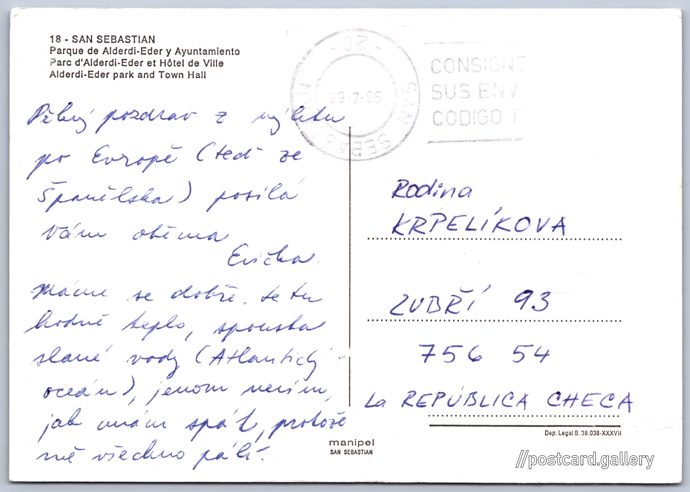 San Sebastian, Alderdi-Eder park Pokud chcete vidět pohlednice ve vyšším rozlišení nebo zobrazovat jejich zadní stranu, tak se prosím nejdříve přihlašte Log in Register 18 - SAN SEBASTIAN- Parque de Alderdi-Eder y Ayuntamiento- Parc d'Alderdi-Eder et Hôtel de Ville- Alderdi-Eder park and Town Hall Language of printed text on postcard: English Alderdieder parkea - Jardines de Alderdi Eder show on map Publisher: Manipel (Spain) Estimated issue date of postcard: 1992 - 1995 Help us specify date of postcard publishing Postcard size (w x h) and shape: 149 x 105 mm (5.87" x 4.13"), rectangle Used postcard:Stamp date: 29.7.1995 DiscussionAdd post Add new folder ... Manage folders ...