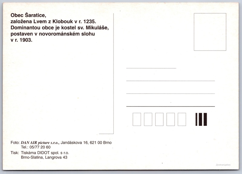 Šaratice, aerial view Pokud chcete vidět pohlednice ve vyšším rozlišení nebo zobrazovat jejich zadní stranu, tak se prosím nejdříve přihlašte Log in Register Obec Šaratice,založena Lvem z Klobouk v r. 1235. Dominantou obce je kostel sv. Mikuláše, postaven v novorománském slohu v r. 1903. Language of printed text on postcard: Czech Náměstí, Šaratice, Vyškov show on map 3 other postcards can be found in the immediate vicinity of the place shown on the postcard Show near postcards Publisher: DAN AIR picture (Czechia) Issue date of postcard is not known Help us estimate date of postcard publishing Postcard size (w x h) and shape: 147 x 104 mm (5.79" x 4.09"), rectangle Persons connected with this postcard: Lev z Klobouk(Postcard content - text) Unused postcard DiscussionAdd post Add new folder ... Manage folders ...