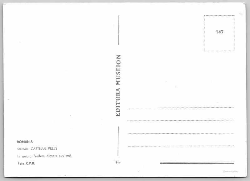 Sinaia, Peleş Castle Pokud chcete vidět pohlednice ve vyšším rozlišení nebo zobrazovat jejich zadní stranu, tak se prosím nejdříve přihlašte Log in Register ROMANIASINAIA. CASTELUL PELEŞIn amurg. Vedere dinspre sud-vest Language of printed text on postcard: Romanian Zámek Peleș, Hrad, Strada Peleșului 2, Sinaia, Rumunsko show on map 3 other postcards can be found in the immediate vicinity of the place shown on the postcard Show near postcards Publisher: Editura Museion (Romania) Issue date of postcard is not known Help us estimate date of postcard publishing Postcard size (w x h) and shape: 147 x 105 mm (5.79" x 4.13"), rectangle Unused postcard Postcard codes: 147 DiscussionAdd post Add new folder ... Manage folders ...