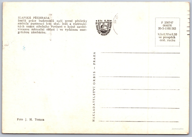 Slap Dam Pokud chcete vidět pohlednice ve vyšším rozlišení nebo zobrazovat jejich zadní stranu, tak se prosím nejdříve přihlašte Log in Register SLAPSKÁ PŘEHRADASmělá práce budovatelů naší první pětiletky změnila pustnoucí kraj skal, lesů a roztroušených samot středního Povltaví v hojně navštěvovanou rekreační oblast i ve vydatnou energetickou zásobárnu. Language of printed text on postcard: Czech Rabyně, Benešov show on map Publisher: Nakladatelství Orbis (Czechoslovakia) Issue year of postcard: May, 1963 Postcard size (w x h) and shape: 145 x 103 mm (5.71" x 4.06"), rectangle Persons connected with this postcard: J. H. Toman(Photo author) Unused postcard Prices: Postcard price: 0,70 Kčs (CSK) (+0,20 Kčs fee to support tourism) Postcard codes: F 256747 064076 20-3-1166 563 DiscussionAdd post Add new folder ... Manage folders ...