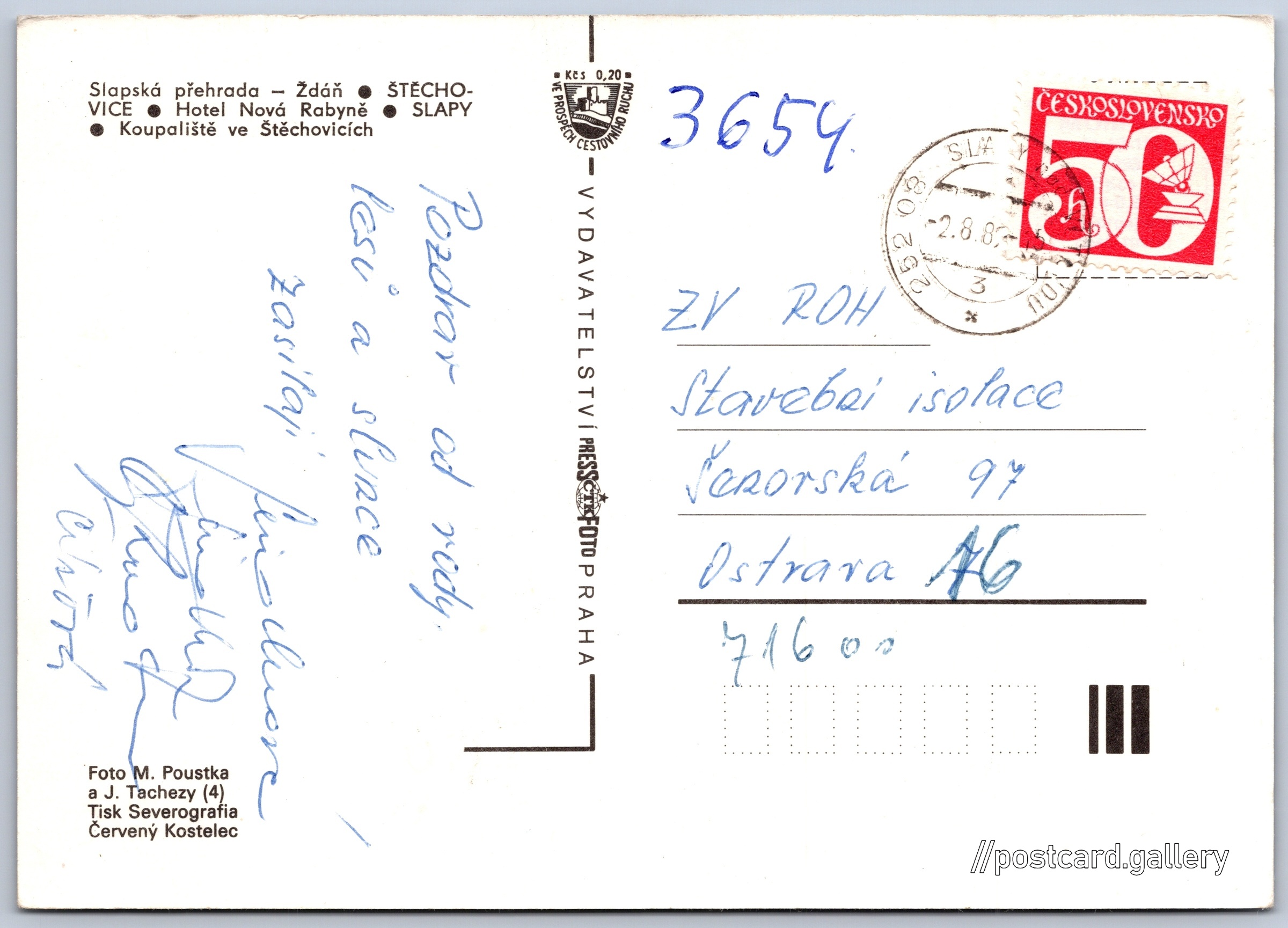 Slapy, Štěchovice Pokud chcete vidět pohlednice ve vyšším rozlišení nebo zobrazovat jejich zadní stranu, tak se prosím nejdříve přihlašte Log in Register Slapy - Štěchovice - Slapská přehrada - Ždáň- ŠTĚCHOVICE- Hotel Nová Rabyně- Koupaliště ve Štěchovicích Language of printed text on postcard: Czech Slapy ev. č. 465, Slapy, 252 08, Praha-západ show on map Publisher: PressFoto Praha (Czechoslovakia) Estimated issue date of postcard: 1979 - 1982 Help us specify date of postcard publishing Postcard size (w x h) and shape: 148 x 105 mm (5.83" x 4.13"), rectangle Persons connected with this postcard: Miroslav Poustka(Photo author) Jan Tachezy(Photo author) Used postcard:Stamp date: 2.8.1982 Prices: Fee to support turism: 0,20 Kčs (CSK)Paid stamps: 0,50 Kčs (CSK) DiscussionAdd post Add new folder ... Manage folders ...
