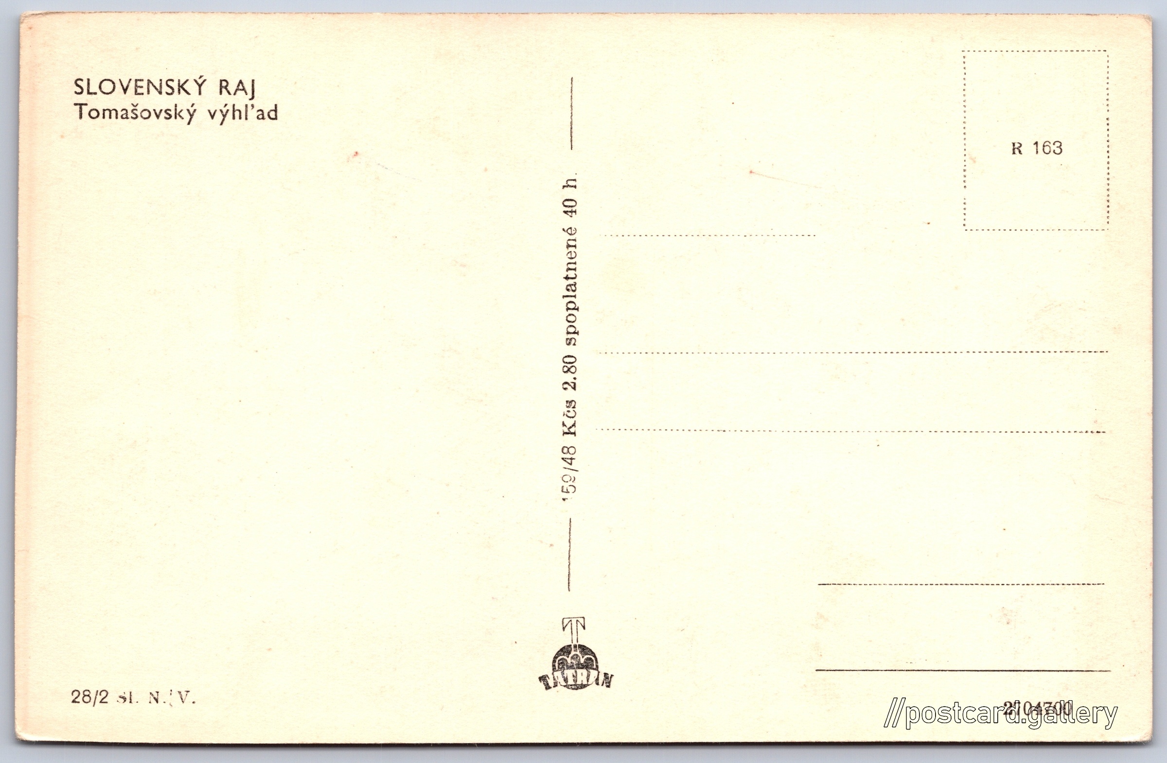 Slovak Paradise, Tomašovské views Pokud chcete vidět pohlednice ve vyšším rozlišení nebo zobrazovat jejich zadní stranu, tak se prosím nejdříve přihlašte Log in Register SLOVENSKÝ RAJTomašovský výhľ'ad Language of printed text on postcard: Slovak Tomášovský výhľad, Výhled, Spišské Tomášovce, Slovensko show on map 7 other postcards can be found in the immediate vicinity of the place shown on the postcard Show near postcards Publisher: Tatran (Czechoslovakia) Issue date of postcard is not known Help us estimate date of postcard publishing Postcard size (w x h) and shape: 139 x 90 mm (5.47" x 3.54"), rectangle Unused postcard Prices: Postcard price: 2,80 Kčs (CSK) (+0,40 Kčs fee to support tourism) Postcard codes: R 163 159/48 28/2 DiscussionAdd post Add new folder ... Manage folders ...