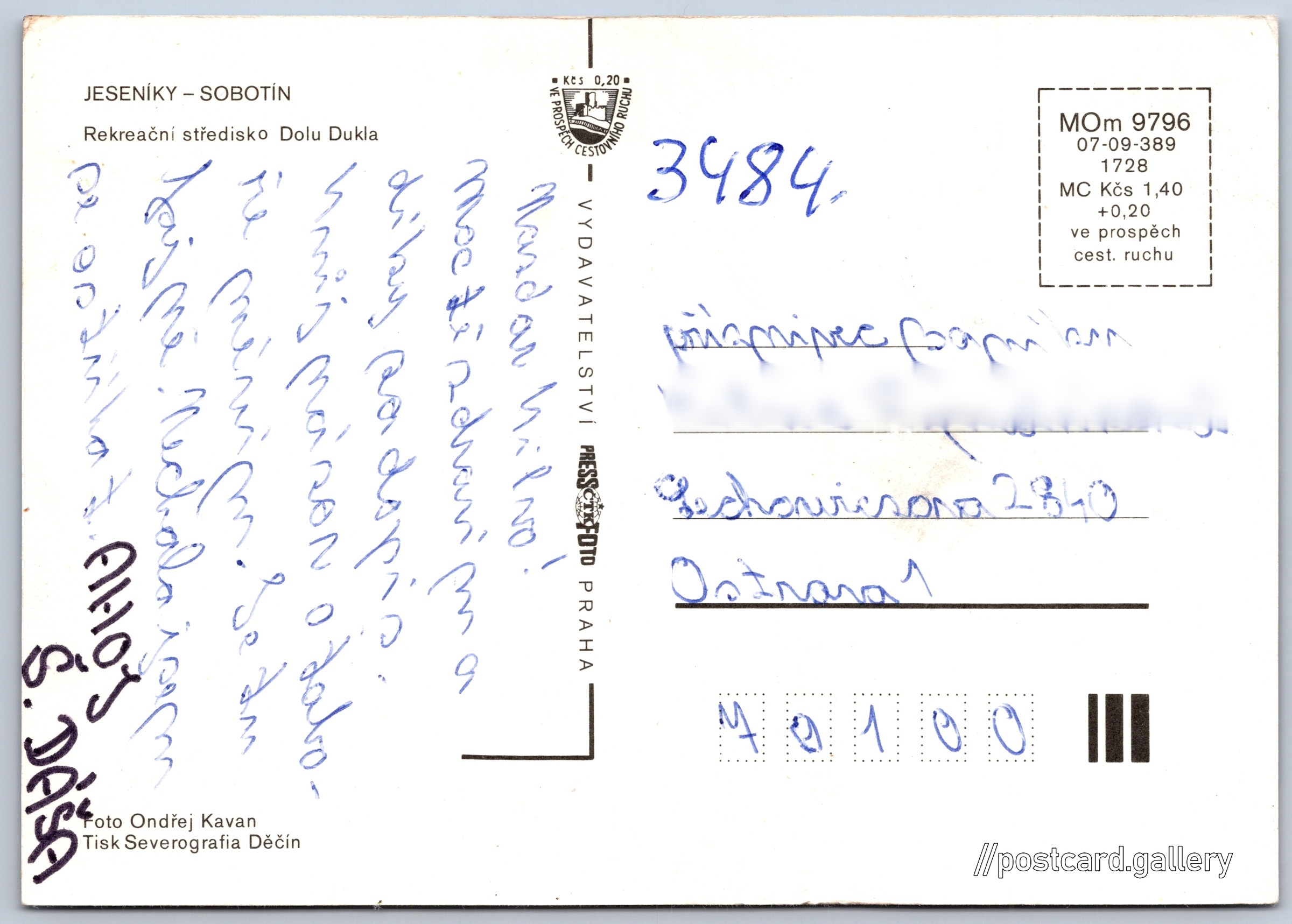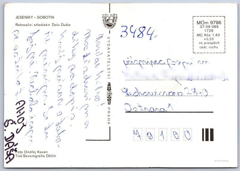 Sobotín Pokud chcete vidět pohlednice ve vyšším rozlišení nebo zobrazovat jejich zadní stranu, tak se prosím nejdříve přihlašte Log in Register Sobotín JESENÍKY - SOBOTÍNRekreační středisko Dolu Dukla Language of printed text on postcard: Czech Sobotín, Šumperk show on map Publisher: PressFoto Praha (Czechoslovakia) Issue year of postcard: 1983 Postcard size (w x h) and shape: 147 x 104 mm (5.79" x 4.09"), rectangle Persons connected with this postcard: Ondřej Kavan(Photo author) Used postcard Prices: Postcard price: 1,40 Kčs (CSK) (+0,20 Kčs fee to support tourism) Postcard codes: MOm 9796 07-09-389 1728 DiscussionAdd post Add new folder ... Manage folders ...
