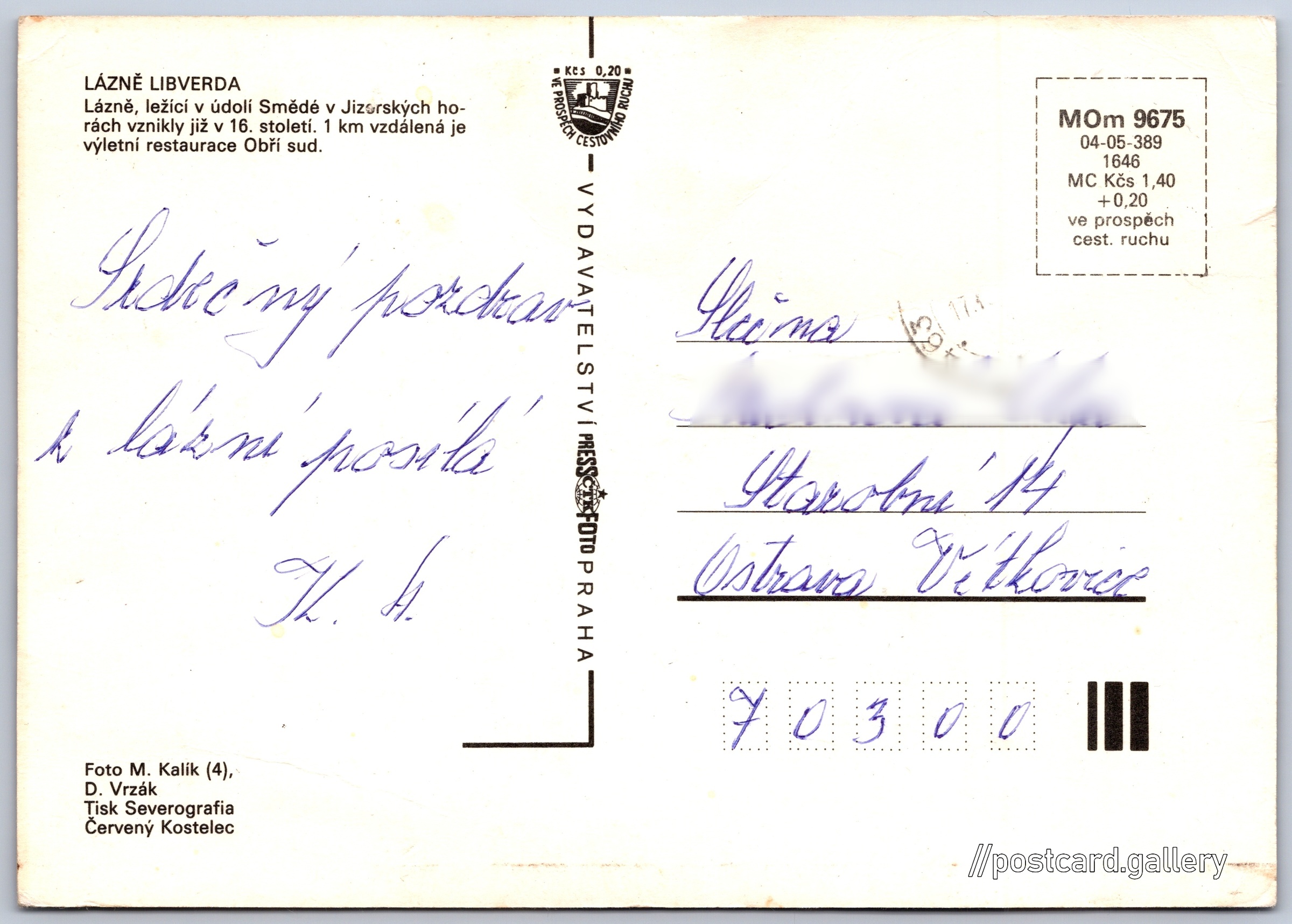 Spa Libverda, Giant barrel Pokud chcete vidět pohlednice ve vyšším rozlišení nebo zobrazovat jejich zadní stranu, tak se prosím nejdříve přihlašte Log in Register Lázně LibverdaObří sud LÁZNĚ LIBVERDALázně, ležící v údolí Smědé v Jizerských horách vznikly již v 16. století. 1 km vzdálená je výletní restaurace Obří sud. Language of printed text on postcard: Czech Lázně Libverda, Obec, Česko show on map Publisher: PressFoto Praha (Czechoslovakia) Issue year of postcard: 1983 Postcard size (w x h) and shape: 149 x 105 mm (5.87" x 4.13"), rectangle Persons connected with this postcard: Daniel Vrzák(Photo author) Miloslav Kalík(Photo author) Used postcard Prices: Postcard price: 1,40 Kčs (CSK) (+0,20 Kčs fee to support tourism) Postcard codes: MOm 9675 04-05-389 1646 DiscussionAdd post Add new folder ... Manage folders ...