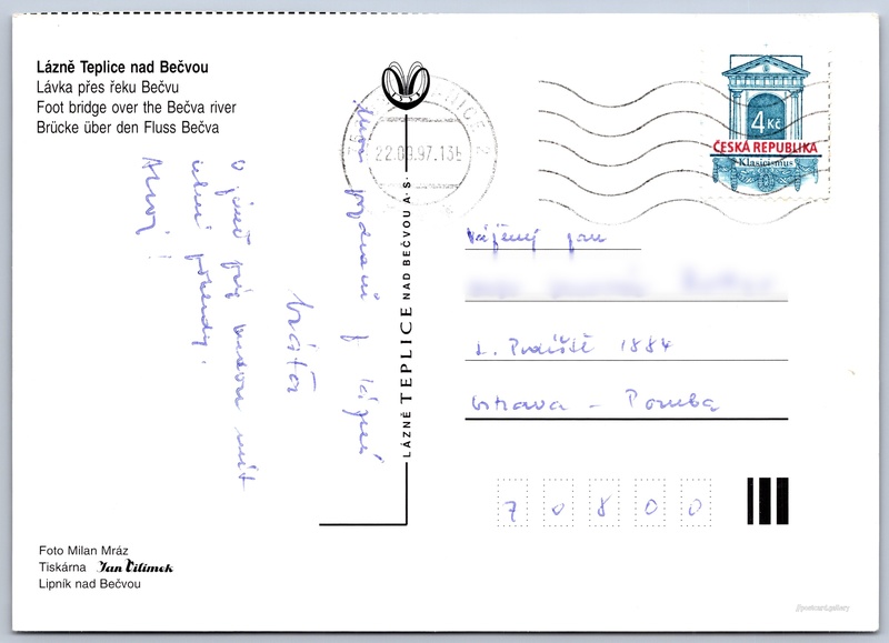 Spa Teplice nad Bečvou Pokud chcete vidět pohlednice ve vyšším rozlišení nebo zobrazovat jejich zadní stranu, tak se prosím nejdříve přihlašte Log in Register Lázně Teplice nad BečvouLávka přes řeku BečvuFoot bridge over the Bečva riverBrücke über den Fluss Bečva Language of printed text on postcard: Czech, English, German Hranice I-Město, Hranice, Přerov show on map Publisher: Lázně Teplice nad Bečvou (Czechia) Estimated issue date of postcard: 1994 - 1997 Help us specify date of postcard publishing Postcard size (w x h) and shape: 147 x 105 mm (5.79" x 4.13"), rectangle Persons connected with this postcard: Milan Mráz(Photo author) Used postcard:Stamp date: 22.9.1997 Prices: Paid stamps: 4,00 Kč (CZK) DiscussionAdd post Add new folder ... Manage folders ...