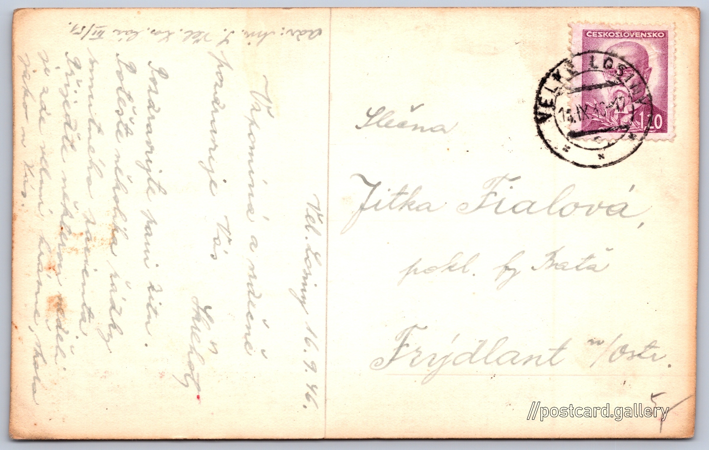 Spa Velké Losiny Pokud chcete vidět pohlednice ve vyšším rozlišení nebo zobrazovat jejich zadní stranu, tak se prosím nejdříve přihlašte Log in Register Language of printed text on postcard: Czech Velké Losiny, Šumperk show on map Estimated issue date of postcard: 1943 - 1946 Help us specify date of postcard publishing Postcard size (w x h) and shape: 142 x 89 mm (5.59" x 3.50"), rectangle Used postcard:Stamp date: 16.9.1946Write date: 16.9.1946 Prices: Paid stamps: 1,20 Kčs (CSK) DiscussionAdd post Add new folder ... Manage folders ...