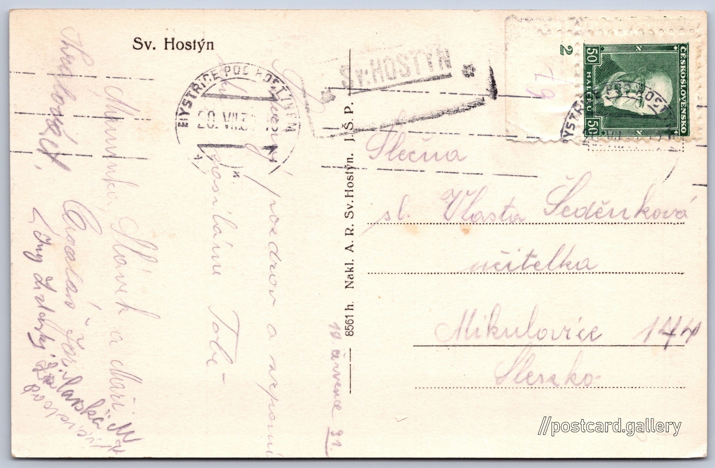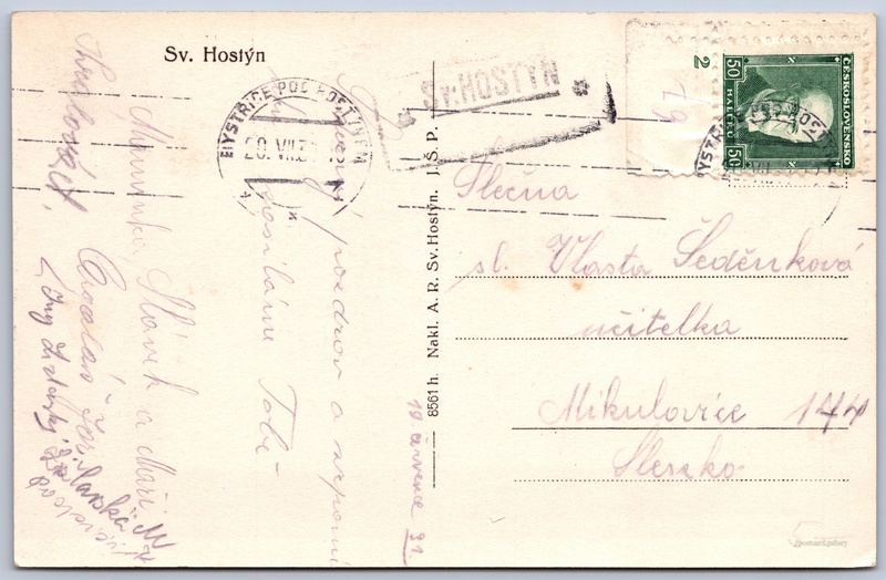 St. Hostýn Pokud chcete vidět pohlednice ve vyšším rozlišení nebo zobrazovat jejich zadní stranu, tak se prosím nejdříve přihlašte Log in Register Sv. Hostýn Language of printed text on postcard: Czech Chvalčov, Kroměříž show on map 16 other postcards can be found in the immediate vicinity of the place shown on the postcard Show near postcards Publisher: A. R. Sv. Hostýn. J. Š. P. (Czechoslovakia) Estimated issue date of postcard: 1928 - 1931 Help us specify date of postcard publishing Postcard size (w x h) and shape: 138 x 90 mm (5.43" x 3.54"), rectangle Used postcard:Stamp date: 20.7.1931Write date: 19.7.1931 Prices: Paid stamps: 0,50 Kčs (CSK) Postcard codes: 8561 h. DiscussionAdd post Add new folder ... Manage folders ...