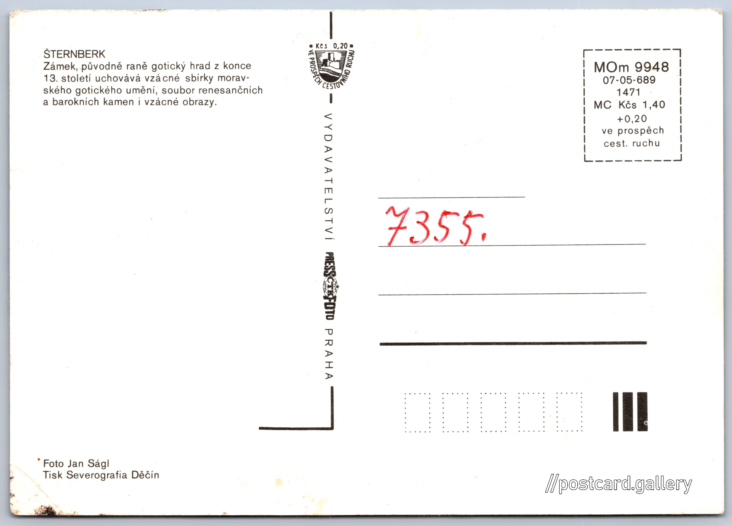 Šternberk Pokud chcete vidět pohlednice ve vyšším rozlišení nebo zobrazovat jejich zadní stranu, tak se prosím nejdříve přihlašte Log in Register Šternberk ŠTERNBERKZámek, původně raně gotický hrad z konce 13. století uchovává vzácné sbírky moravského gotického umění, soubor renesančnícha barokních kamen i vzácné obrazy. Language of printed text on postcard: Czech Šternberk, Olomouc show on map Publisher: PressFoto Praha (Czechoslovakia) Issue year of postcard: 1986 Postcard size (w x h) and shape: 148 x 105 mm (5.83" x 4.13"), rectangle Persons connected with this postcard: Jan Ságl(Photo author) Unused postcard Prices: Postcard price: 1,40 Kčs (CSK) (+0,20 Kčs fee to support tourism) Postcard codes: MOm 9948 07-05-689 1471 DiscussionAdd post Add new folder ... Manage folders ...