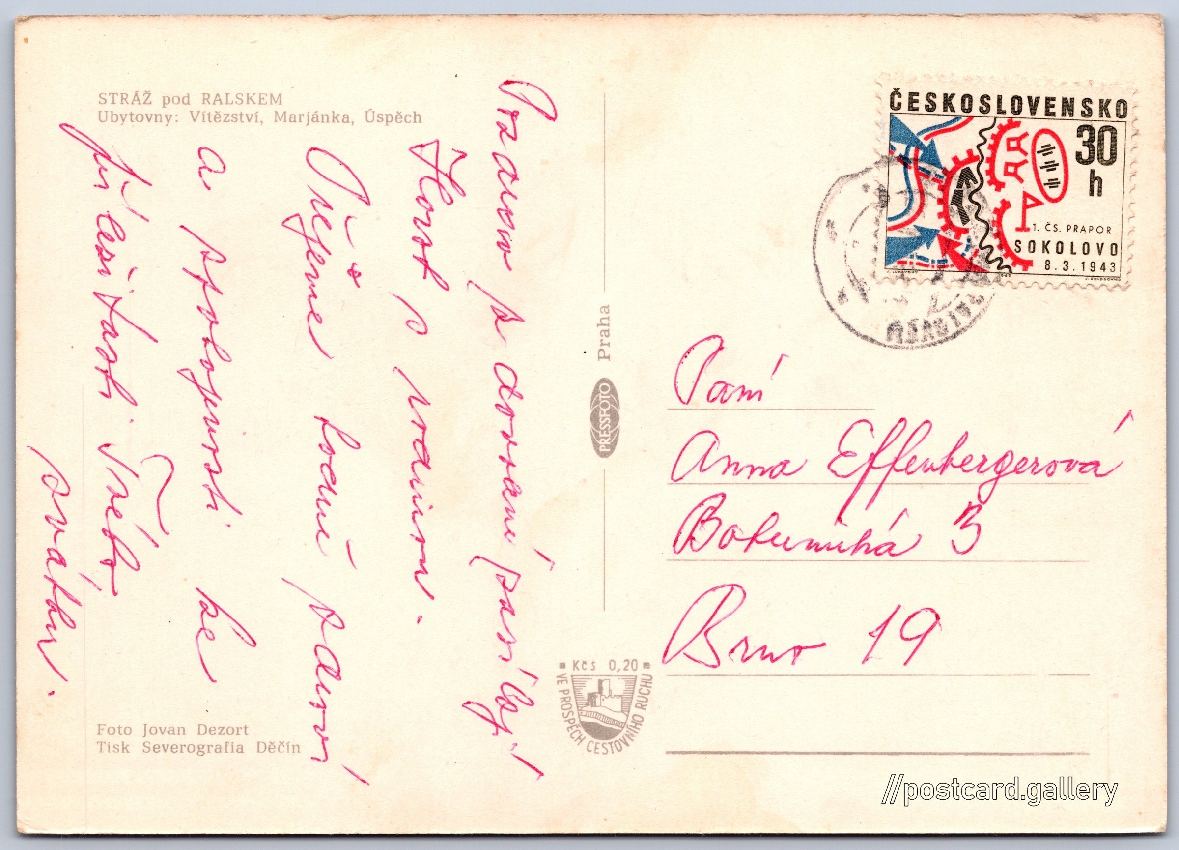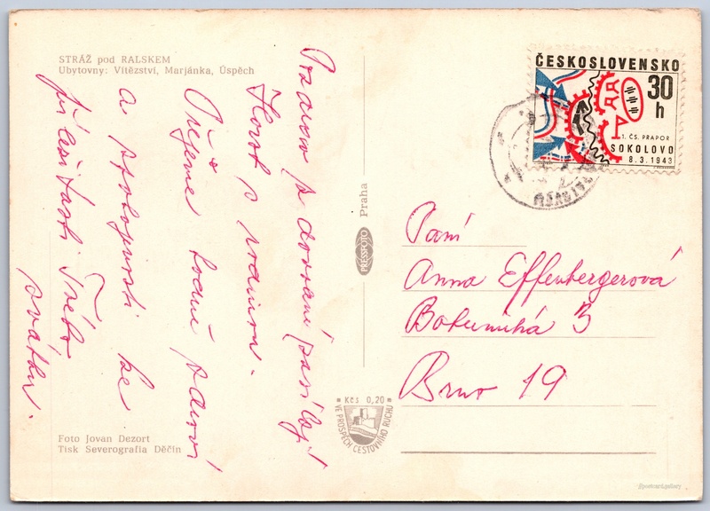 Stráž pod Ralskem, hostels Pokud chcete vidět pohlednice ve vyšším rozlišení nebo zobrazovat jejich zadní stranu, tak se prosím nejdříve přihlašte Log in Register STRÁŽ pod RALSKEMUbytovny: Vítězství, Marjánka, Úspěch Language of printed text on postcard: Czech Revoluční 206, Stráž pod Ralskem, 471 27, Česká Lípa show on map 8 other postcards can be found in the immediate vicinity of the place shown on the postcard Show near postcards Publisher: PressFoto Praha (Czechoslovakia) Issue date of postcard is not known Help us estimate date of postcard publishing Postcard size (w x h) and shape: 148 x 104 mm (5.83" x 4.09"), rectangle Persons connected with this postcard: Jovan Dezort(Photo author) Used postcard Prices: Fee to support turism: 0,20 Kčs (CSK)Paid stamps: 0,30 Kčs (CSK) DiscussionAdd post Add new folder ... Manage folders ...