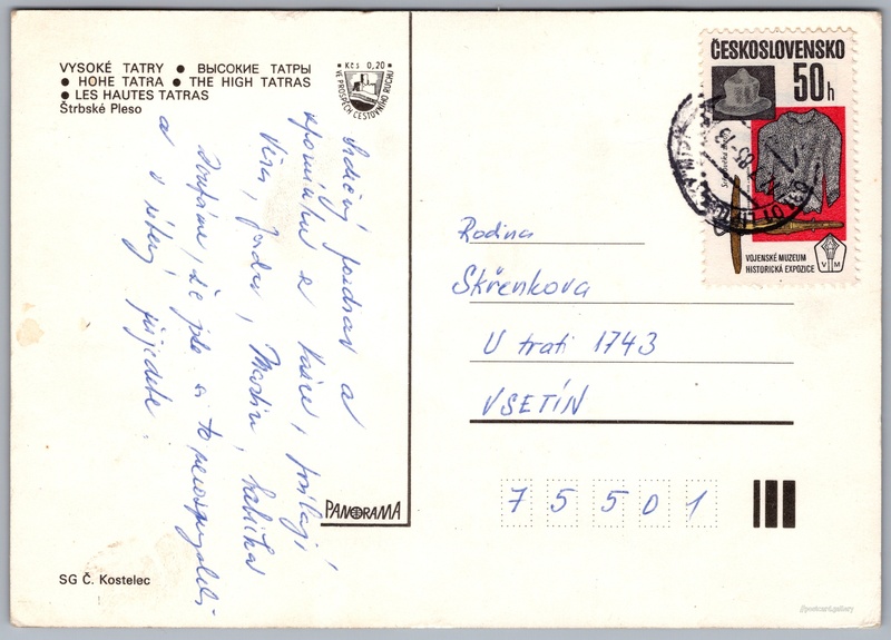 Štrbské pleso Pokud chcete vidět pohlednice ve vyšším rozlišení nebo zobrazovat jejich zadní stranu, tak se prosím nejdříve přihlašte Log in Register Štrbské pleso VYSOKÉ TATRY - HOHE TATRA - ВЫСОКИЕ ТАТРЫ - THE HIGH TATRAS - LES HAUTES TATRASŠtrbské Pleso Language of printed text on postcard: Czech Štrbské Pleso, Vesnice, Slovensko show on map 79 other postcards can be found in the immediate vicinity of the place shown on the postcard Show near postcards Publisher: Panorama (Czechoslovakia) Estimated issue date of postcard: 1982 - 1985 Help us specify date of postcard publishing Postcard size (w x h) and shape: 148 x 105 mm (5.83" x 4.13"), rectangle Used postcard:Stamp date: 12.7.1985 Prices: Fee to support turism: 0,20 Kčs (CSK)Paid stamps: 0,50 Kčs (CSK) DiscussionAdd post Add new folder ... Manage folders ...