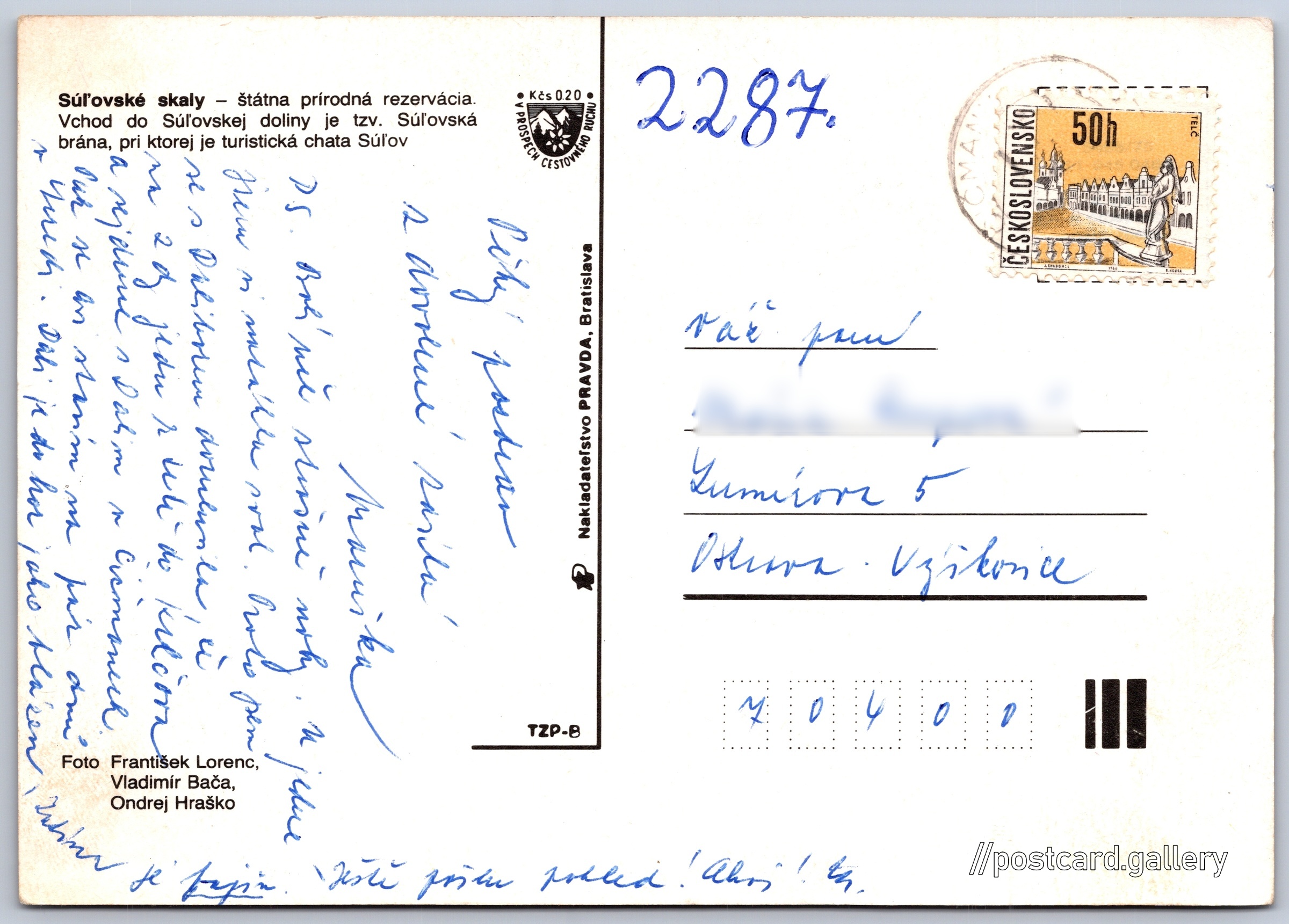 Sulov Rocks Pokud chcete vidět pohlednice ve vyšším rozlišení nebo zobrazovat jejich zadní stranu, tak se prosím nejdříve přihlašte Log in Register Súľovské skaly Súľovské skaly - štátna prírodná rezervácia.Vchod do Súľovskej doliny je tzv. Súľovská brána, pri ktorej je turistická chata Súľov. Language of printed text on postcard: Slovak Chata Súľov, Súľov-Hradná 5, Súľov-Hradná, Slovensko show on map Publisher: Nakladateľstvo PRAVDA, Bratislava (Czechoslovakia) Issue date of postcard is not known Help us estimate date of postcard publishing Postcard size (w x h) and shape: 148 x 104 mm (5.83" x 4.09"), rectangle Persons connected with this postcard: František Lorenc(Photo author) Vladimír Bača(Photo author) Ondrej Hraško(Photo author) Used postcard Prices: Fee to support turism: 0,20 Kčs (CSK)Paid stamps: 0,50 Kčs (CSK) DiscussionAdd post Add new folder ... Manage folders ...
