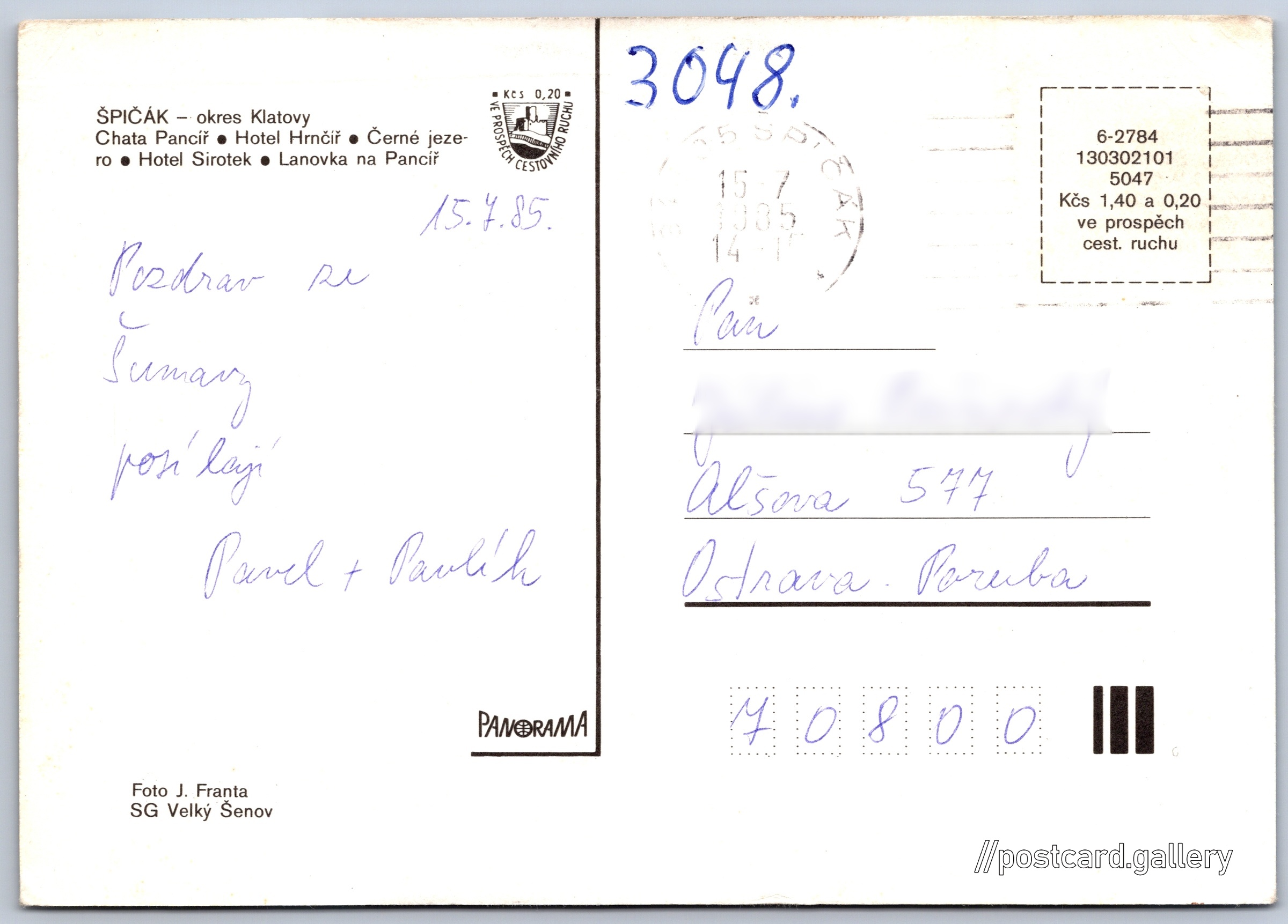 Šumava, Špičák Pokud chcete vidět pohlednice ve vyšším rozlišení nebo zobrazovat jejich zadní stranu, tak se prosím nejdříve přihlašte Log in Register Špičák ŠPIČÁK - okres Klatovy- Chata Pancíř- Hotel Hrnčíř- Černé jezero- Hotel Sirotek- Lanovka na Pancíř Language of printed text on postcard: Czech Pancíř 2, Železná Ruda, 340 04, Klatovy show on map Publisher: Panorama (Czechoslovakia) Estimated issue date of postcard: 1982 - 1985 Help us specify date of postcard publishing Postcard size (w x h) and shape: 149 x 105 mm (5.87" x 4.13"), rectangle Persons connected with this postcard: J. Franta(Photo author) Used postcard:Stamp date: 15.7.1985 Prices: Postcard price: 1,40 Kčs (CSK) (+0,20 Kčs fee to support tourism) Postcard codes: 6-2784 130302101 5047 DiscussionAdd post Add new folder ... Manage folders ...