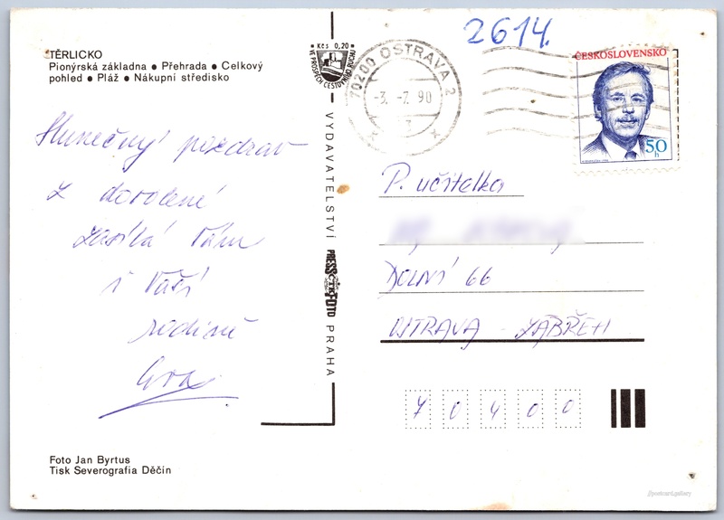 Těrlicko Pokud chcete vidět pohlednice ve vyšším rozlišení nebo zobrazovat jejich zadní stranu, tak se prosím nejdříve přihlašte Log in Register Těrlicko TĚRLICKO- Pionýrská základna- Přehrada- Celkový pohled- Pláž- Nákupní středisko Language of printed text on postcard: Czech Vodní nádrž Těrlicko, Vodní plocha, Těrlicko, Česko show on map Publisher: PressFoto Praha (Czechoslovakia) Estimated issue date of postcard: 1987 - 1990 Help us specify date of postcard publishing Postcard size (w x h) and shape: 148 x 105 mm (5.83" x 4.13"), rectangle Persons connected with this postcard: Jan Byrtus(Photo author) Used postcard:Stamp date: 3.7.1990 Prices: Fee to support turism: 0,20 Kčs (CSK)Paid stamps: 0,50 Kčs (CSK) DiscussionAdd post Add new folder ... Manage folders ...