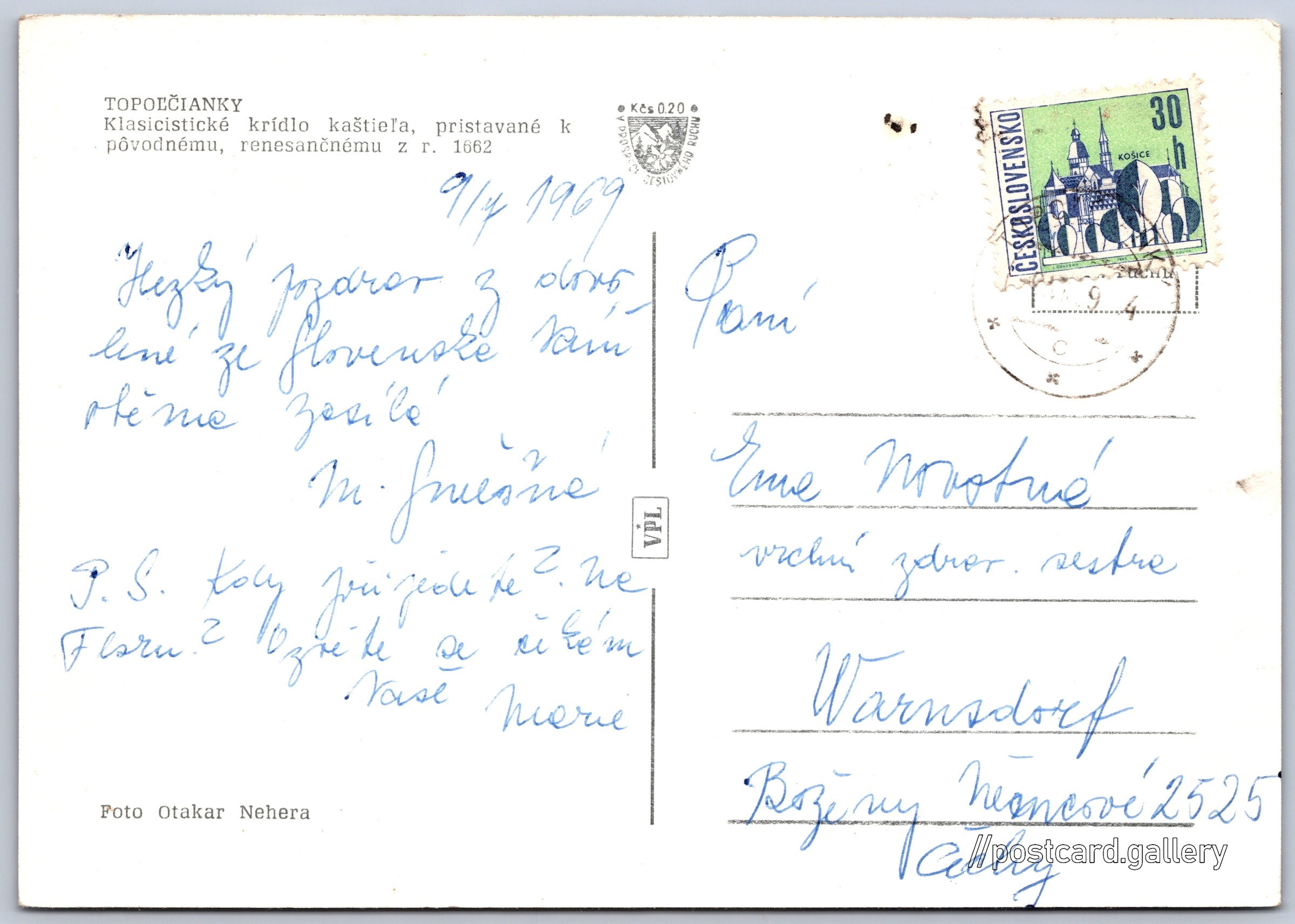 Topolčianky, manor house Pokud chcete vidět pohlednice ve vyšším rozlišení nebo zobrazovat jejich zadní stranu, tak se prosím nejdříve přihlašte Log in Register TOPOĽČIANKYKlasicistické krídlo kaštieľa, pristavané k pôvodnému, renesančnému z r. 1662 Language of printed text on postcard: Slovak Parková 242/1 show on map 3 other postcards can be found in the immediate vicinity of the place shown on the postcard Show near postcards Publisher: VPL (Czechoslovakia) Estimated issue date of postcard: 1966 - 1969 Help us specify date of postcard publishing Postcard size (w x h) and shape: 146 x 103 mm (5.75" x 4.06"), rectangle Persons connected with this postcard: Otakar Nehera(Photo author) Used postcard:Write date: 9.7.1969 Prices: Fee to support turism: 0,20 Kčs (CSK)Paid stamps: 0,30 Kčs (CSK) DiscussionAdd post Add new folder ... Manage folders ...