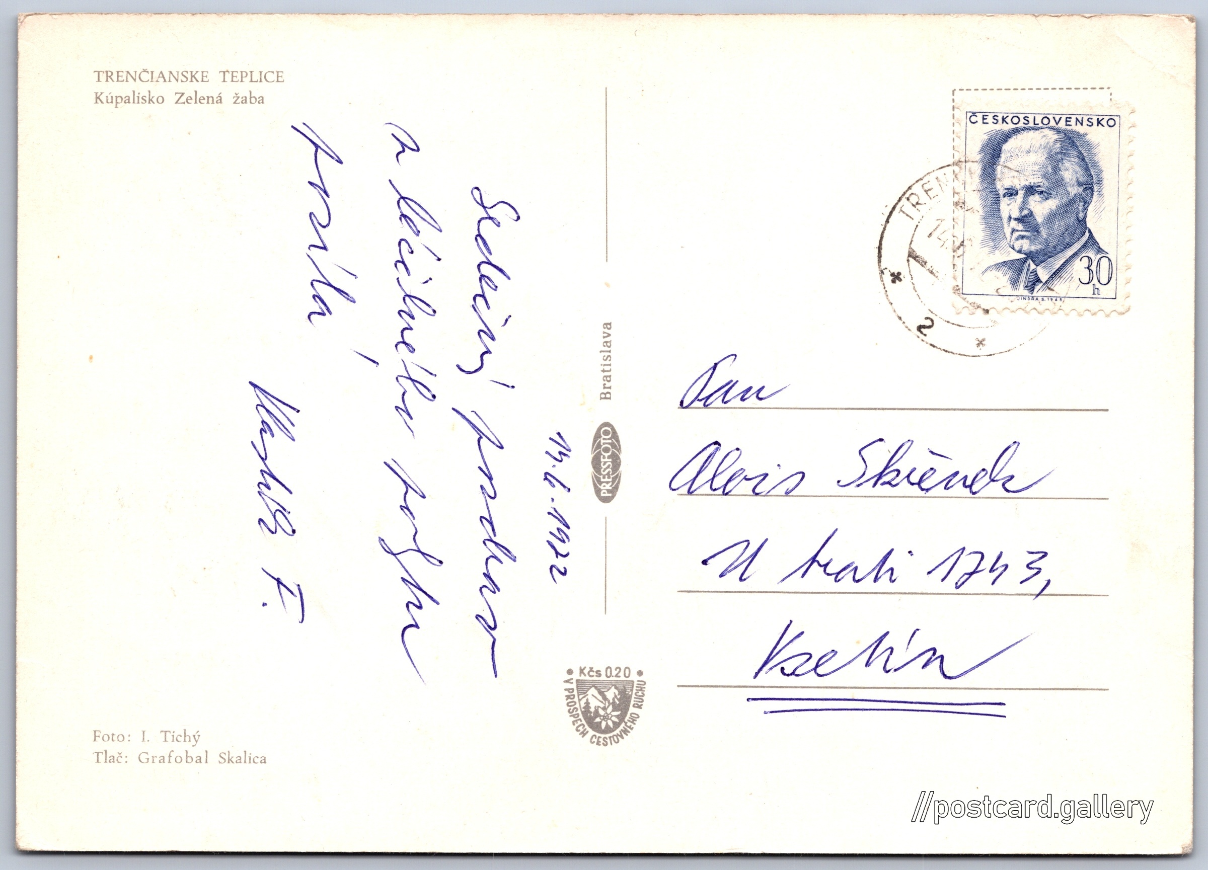 Trencianske Teplice, swimming pool Zelená Žaba Pokud chcete vidět pohlednice ve vyšším rozlišení nebo zobrazovat jejich zadní stranu, tak se prosím nejdříve přihlašte Log in Register TRENČIANSKE TEPLICEKúpalisko Zelená žaba Language of printed text on postcard: Slovak Trenčianske Teplice show on map 13 other postcards can be found in the immediate vicinity of the place shown on the postcard Show near postcards Publisher: PressFoto Bratislava (Czechoslovakia) Estimated issue date of postcard: 1969 - 1972 Help us specify date of postcard publishing Postcard size (w x h) and shape: 148 x 105 mm (5.83" x 4.13"), rectangle Persons connected with this postcard: Ivan Tichý(Photo author) Used postcard:Stamp date: 14.6.1972Write date: 14.6.1972 Prices: Fee to support turism: 0,20 Kčs (CSK)Paid stamps: 0,30 Kčs (CSK) DiscussionAdd post Add new folder ... Manage folders ...