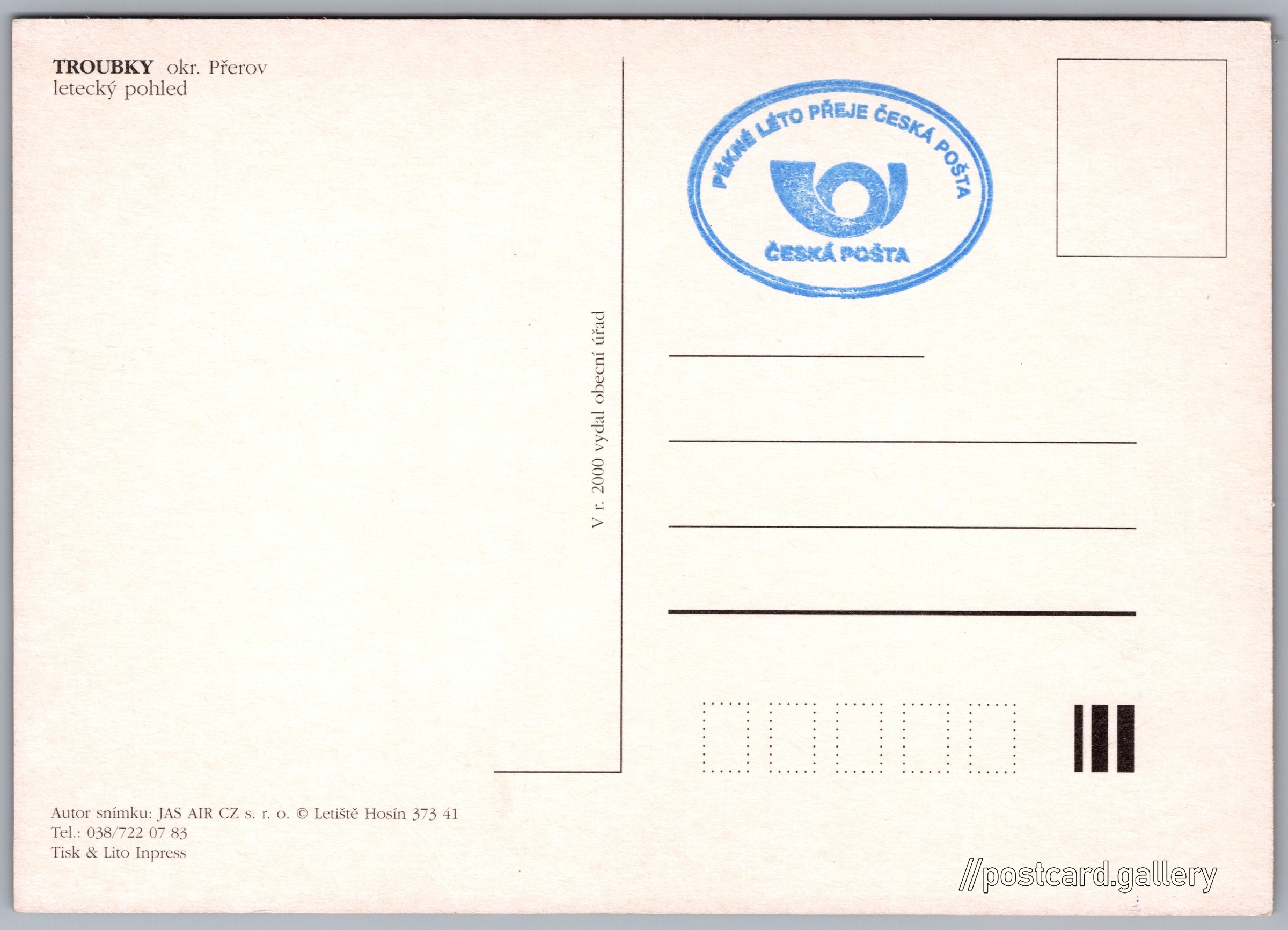 Tubes, aerial view Pokud chcete vidět pohlednice ve vyšším rozlišení nebo zobrazovat jejich zadní stranu, tak se prosím nejdříve přihlašte Log in Register Troubky TROUBKY okr. Přerovletecký pohled Language of printed text on postcard: Czech Troubky, Obec, Česko show on map 1 other postcard can be found in the immediate vicinity of the place shown on the postcard Show near postcards Publisher: Obecní úřad Troubky (Czechia) Issue year of postcard: 2000 Postcard size (w x h) and shape: 148 x 105 mm (5.83" x 4.13"), rectangle Unused postcard DiscussionAdd post Add new folder ... Manage folders ...