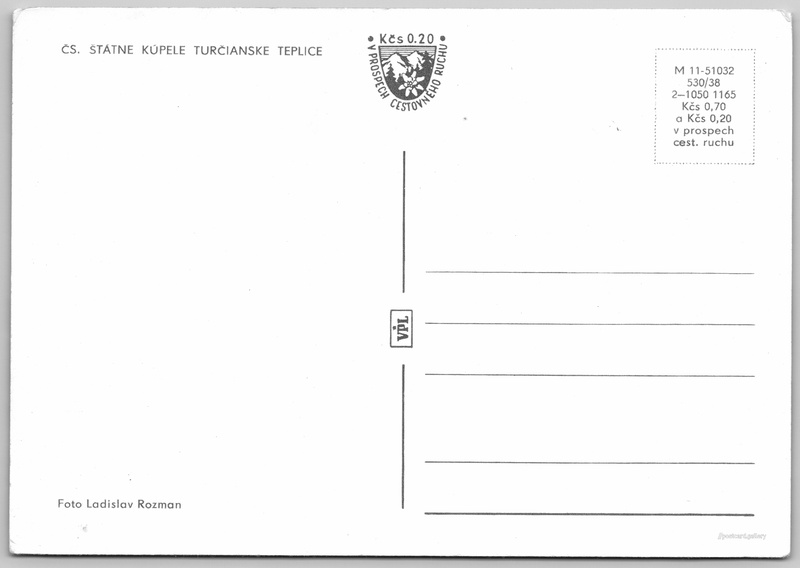 Turčianske Teplice, spa Pokud chcete vidět pohlednice ve vyšším rozlišení nebo zobrazovat jejich zadní stranu, tak se prosím nejdříve přihlašte Log in Register ČS. ŠTÁTNE KÚPELE TURČIANSKE TEPLICE Language of printed text on postcard: Slovak Turčianske Teplice, Město, Slovensko show on map 7 other postcards can be found in the immediate vicinity of the place shown on the postcard Show near postcards Publisher: VPL (Czechoslovakia) Issue date of postcard is not known Help us estimate date of postcard publishing Postcard size (w x h) and shape: 150 x 105 mm (5.91" x 4.13"), rectangle Persons connected with this postcard: Ladislav Rozman(Photo author) Unused postcard Prices: Postcard price: 0,70 Kčs (CSK) (+0,20 Kčs fee to support tourism) Postcard codes: M 11-51032 530/38 2-1050 1165 DiscussionAdd post Add new folder ... Manage folders ...