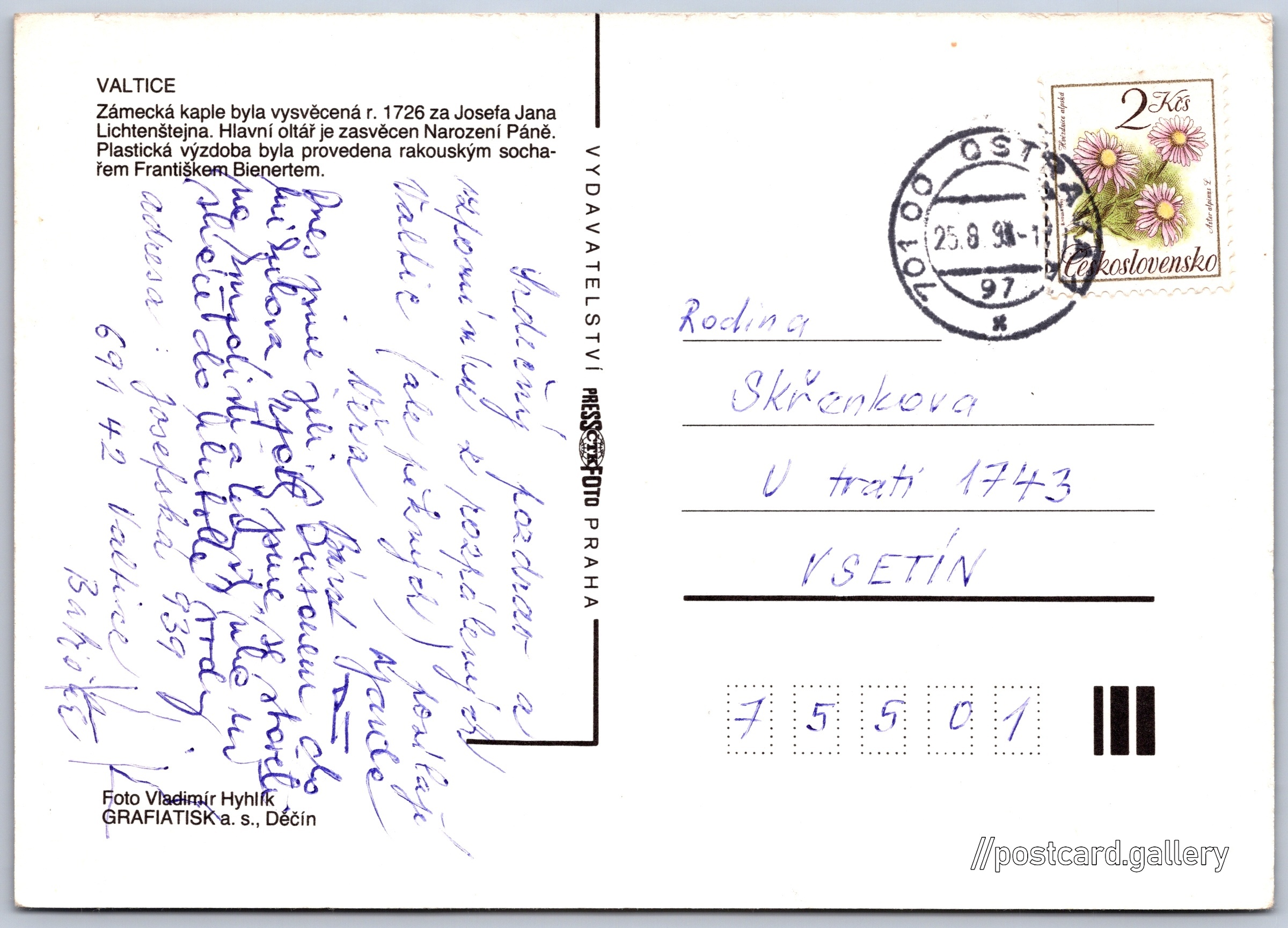 Valtice, castle chapel 1/4 Pokud chcete vidět pohlednice ve vyšším rozlišení nebo zobrazovat jejich zadní stranu, tak se prosím nejdříve přihlašte Log in Register VALTICEZámecká kaple byla vysvěcená r. 1726 za Josefa Jana Lichtenštejna. Hlavní oltář je zasvěcen Narození Páně. Plastická výzdoba byla provedena rakouským sochařem Františkem Bienertem. Language of printed text on postcard: Czech Valtice, Břeclav show on map 4 other postcards can be found in the immediate vicinity of the place shown on the postcard Show near postcards Publisher: PressFoto Praha (Czechoslovakia) Estimated issue date of postcard: 1987 - 1990 Help us specify date of postcard publishing Postcard size (w x h) and shape: 148 x 105 mm (5.83" x 4.13"), rectangle Persons connected with this postcard: Vladimír Hyhlík(Photo author) Used postcard:Stamp date: 25.8.1990 Prices: Paid stamps: 2,00 Kčs (CSK) DiscussionAdd post Add new folder ... Manage folders ...