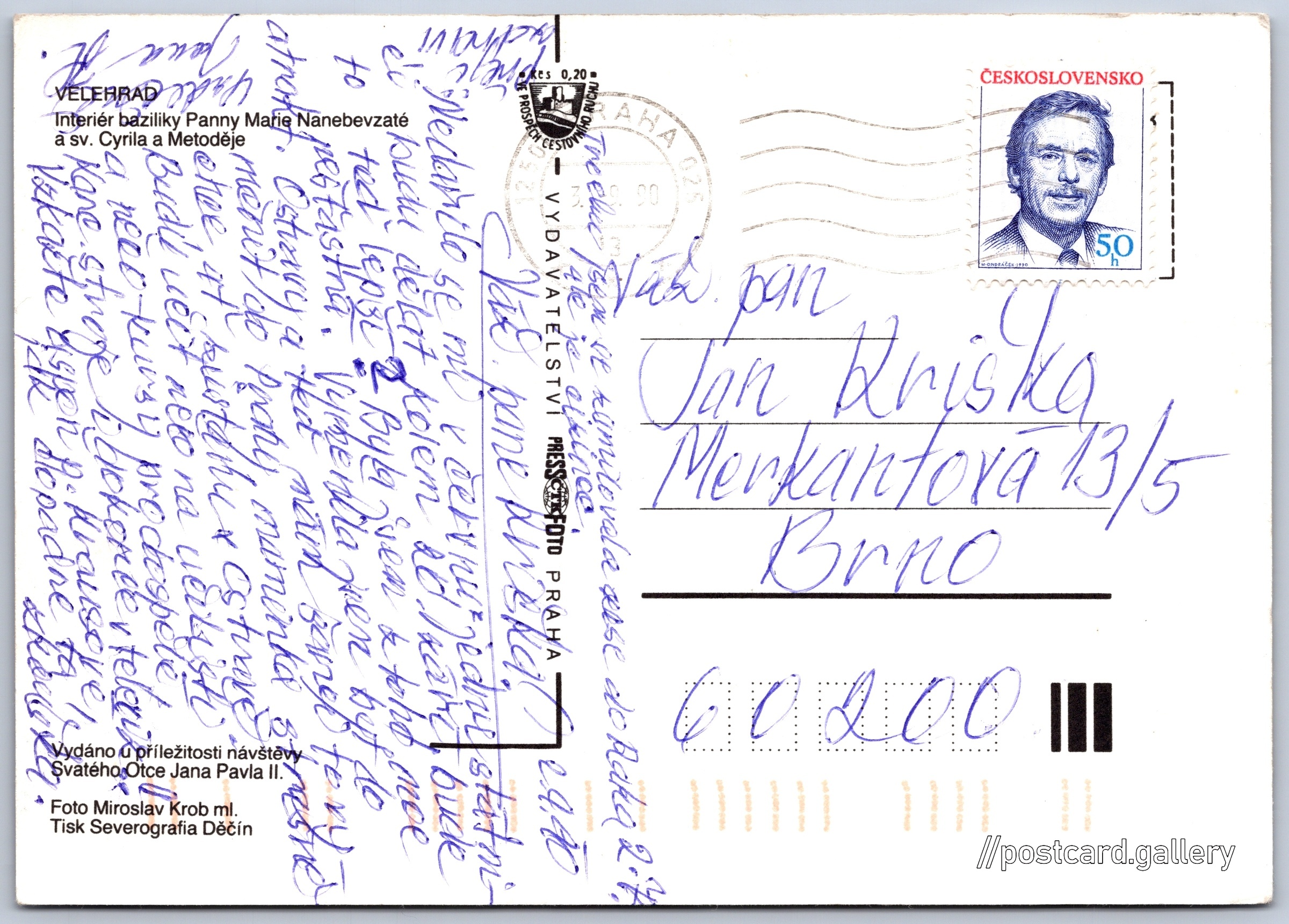 Velehrad, interior of the basilica Pokud chcete vidět pohlednice ve vyšším rozlišení nebo zobrazovat jejich zadní stranu, tak se prosím nejdříve přihlašte Log in Register VELEHRADInteriér baziliky Panny Marie Nanebevzaté a sv. Cyrila a Metoděje Language of printed text on postcard: Czech Nádvoří 37, 687 06 Velehrad, Czechia show on map 16 other postcards can be found in the immediate vicinity of the place shown on the postcard Show near postcards Publisher: PressFoto Praha (Czechoslovakia) Estimated issue date of postcard: 1987 - 1990 Help us specify date of postcard publishing Postcard size (w x h) and shape: 148 x 105 mm (5.83" x 4.13"), rectangle Persons connected with this postcard: Miroslav Krob ml.(Photo author) Used postcard:Stamp date: 3.9.1990 Prices: Fee to support turism: 0,20 Kčs (CSK)Paid stamps: 0,50 Kčs (CSK) DiscussionAdd post Add new folder ... Manage folders ...