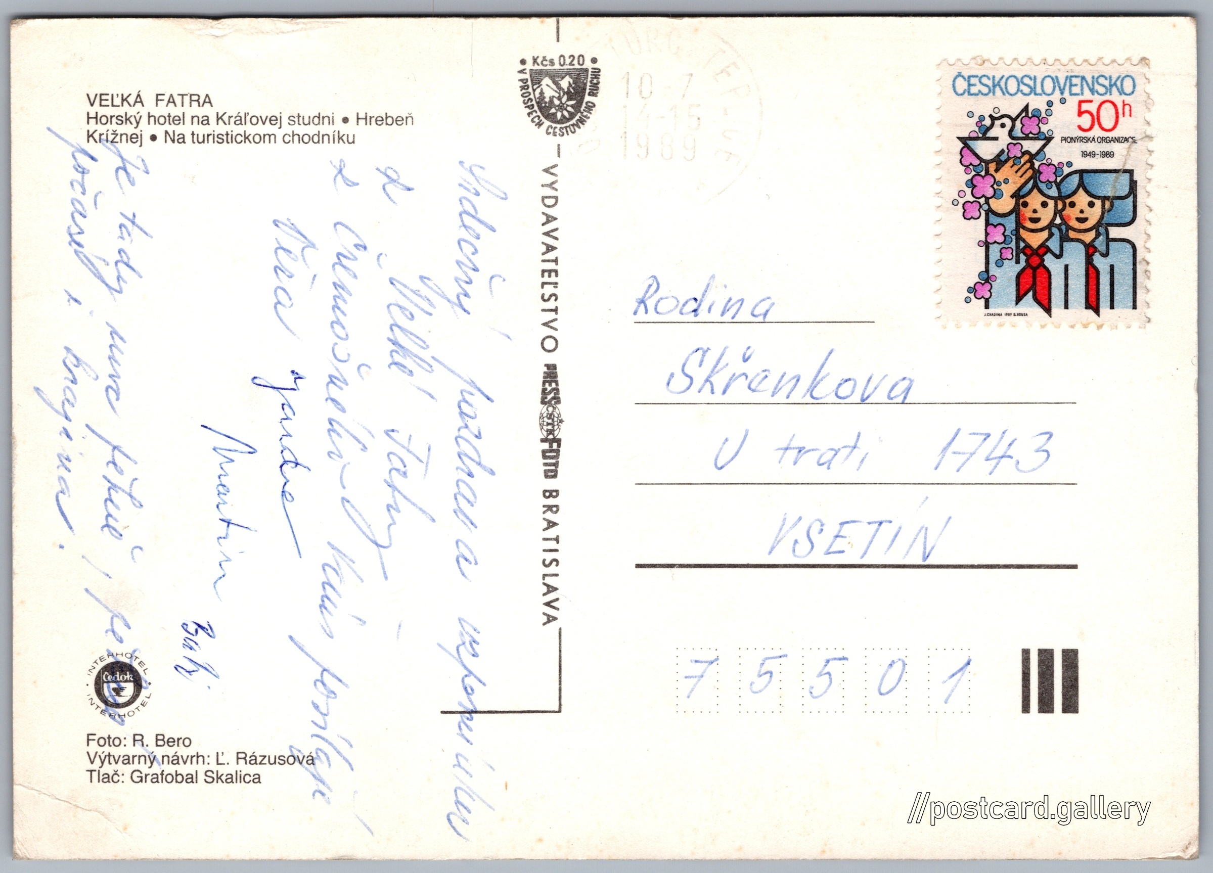 Veľká Fatra, Kráľova studňa Pokud chcete vidět pohlednice ve vyšším rozlišení nebo zobrazovat jejich zadní stranu, tak se prosím nejdříve přihlašte Log in Register Veľká Fatra VEĽKÁ FATRA- Horský hotel na Kráľovej studni- Hrebeň Krížnej- Na turistickom chodníku Language of printed text on postcard: Slovak Horský hotel Kráľova Studňa, Chata, bouda, Dolný Harmanec 92, Dolný Harmanec, Slovensko show on map Publisher: PressFoto Bratislava (Czechoslovakia) Issue date of postcard is not known Help us estimate date of postcard publishing Postcard size (w x h) and shape: 148 x 105 mm (5.83" x 4.13"), rectangle Persons connected with this postcard: Ing. R. Bero(Photo author) Ľ. Rázusová(Postcard designer) Used postcard Prices: Fee to support turism: 0,20 Kčs (CSK)Paid stamps: 0,50 Kčs (CSK) DiscussionAdd post Add new folder ... Manage folders ...