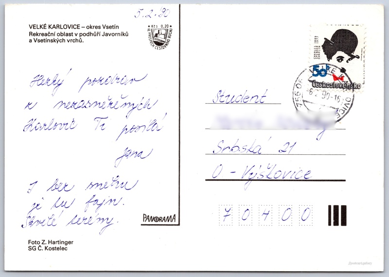Velké Karlovice, zima Pokud chcete vidět pohlednice ve vyšším rozlišení nebo zobrazovat jejich zadní stranu, tak se prosím nejdříve přihlašte Log in Register Velké Karlovice VELKÉ KARLOVICE - okres VsetínRekreační oblast v podhůří Javorníků a Vsetínských vrchů. Language of printed text on postcard: Czech Velké Karlovice, Vsetín show on map Publisher: Panorama (Czechoslovakia) Estimated issue date of postcard: 1987 - 1990 Help us specify date of postcard publishing Postcard size (w x h) and shape: 148 x 105 mm (5.83" x 4.13"), rectangle Persons connected with this postcard: Zd. Hartinger(Photo author) Used postcard:Stamp date: 6.2.1990Write date: 5.2.1990 Prices: Fee to support turism: 0,20 Kčs (CSK)Paid stamps: 0,50 Kčs (CSK) DiscussionAdd post Add new folder ... Manage folders ...