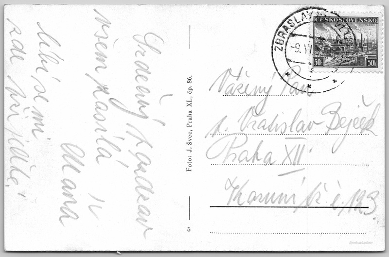Vrané na Vltavou Pokud chcete vidět pohlednice ve vyšším rozlišení nebo zobrazovat jejich zadní stranu, tak se prosím nejdříve přihlašte Log in Register Vrané Language of printed text on postcard: Czech Vrané nad Vltavou, Praha-západ show on map Publisher: Foto J. Švec (Czechoslovakia) Estimated issue date of postcard: 1936 - 1939 Help us specify date of postcard publishing Postcard size (w x h) and shape: 139 x 91 mm (5.47" x 3.58"), rectangle Used postcard:Stamp date: 9.6.1939 Prices: Paid stamps: 0,50 Kčs (CSK) Postcard codes: 5 DiscussionAdd post Add new folder ... Manage folders ...