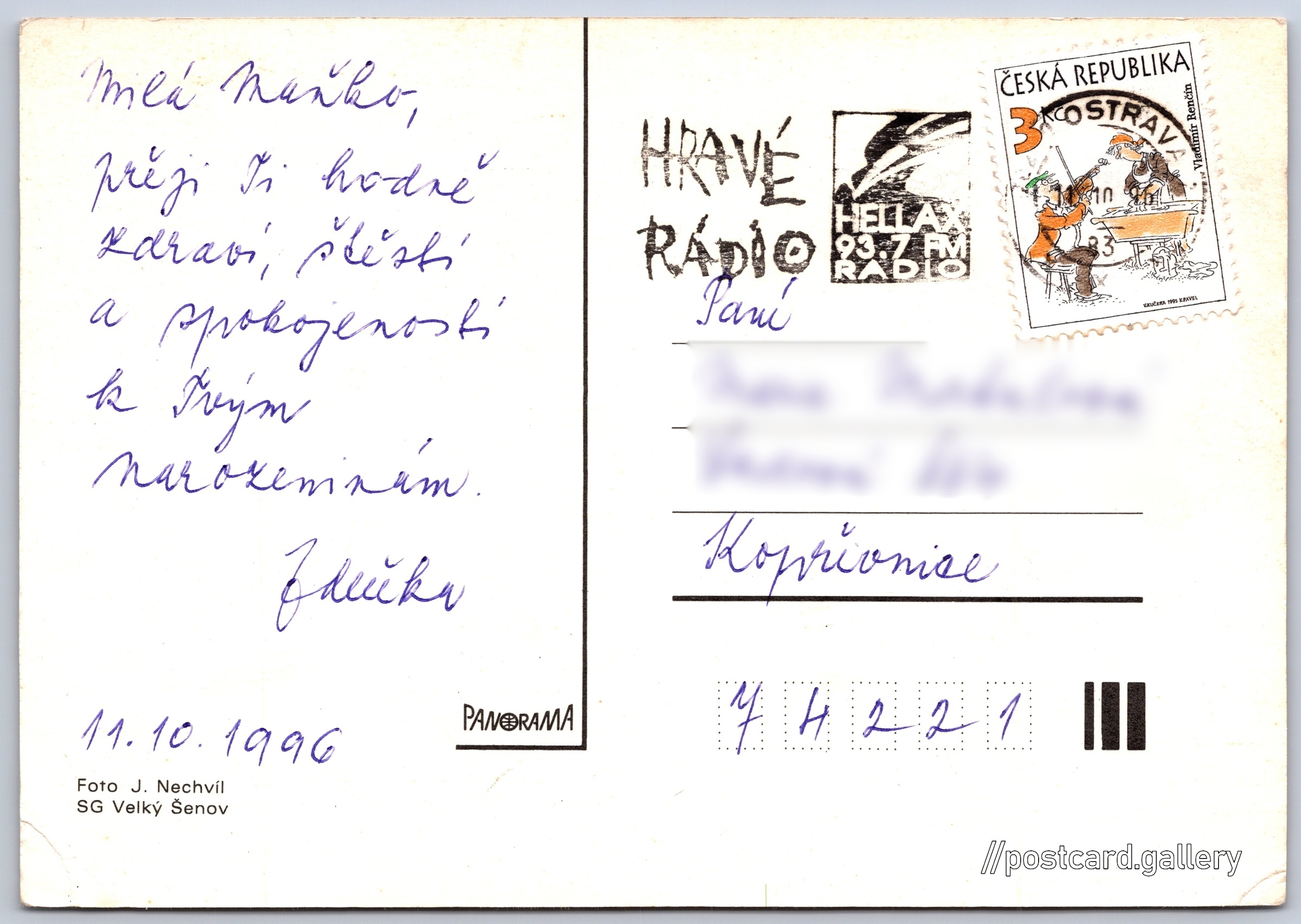 Wishes, bouquets Pokud chcete vidět pohlednice ve vyšším rozlišení nebo zobrazovat jejich zadní stranu, tak se prosím nejdříve přihlašte Log in Register Language of printed text on postcard: Czech Publisher: Panorama (Czechoslovakia) Estimated issue date of postcard: 1990 - 1993 Help us specify date of postcard publishing Postcard size (w x h) and shape: 148 x 104 mm (5.83" x 4.09"), rectangle Persons connected with this postcard: Jiří Nechvíl(Photo author) Used postcard:Stamp date: 11.10.1996Write date: 11.10.1996 Prices: Paid stamps: 3,00 Kč (CZK) DiscussionAdd post Add new folder ... Manage folders ...