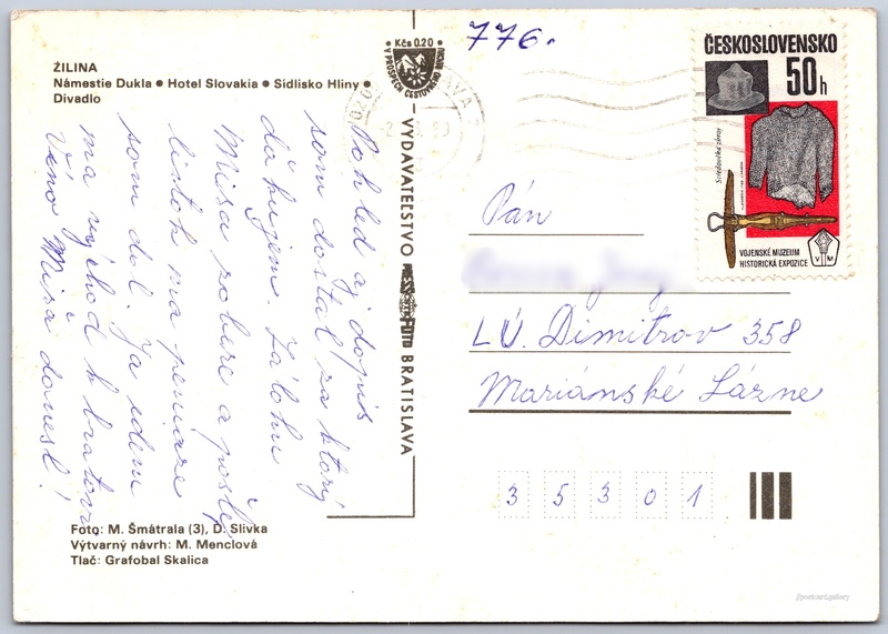 Žilina Pokud chcete vidět pohlednice ve vyšším rozlišení nebo zobrazovat jejich zadní stranu, tak se prosím nejdříve přihlašte Log in Register Žilina ŽILINA- Námestie Dukla- Hotel Slovakia- Sídlisko Hliny- Divadlo Language of printed text on postcard: Slovak Mariánske námestie show on map Publisher: PressFoto Bratislava (Czechoslovakia) Estimated issue date of postcard: 1986 - 1989 Help us specify date of postcard publishing Postcard size (w x h) and shape: 149 x 105 mm (5.87" x 4.13"), rectangle Persons connected with this postcard: D. Slivka(Photo author) Milan Šmátrala(Photo author) M. Menclová(Postcard designer) Used postcard:Stamp date: 2.3.1989 Prices: Fee to support turism: 0,20 Kčs (CSK)Paid stamps: 0,50 Kčs (CSK) DiscussionAdd post Add new folder ... Manage folders ...