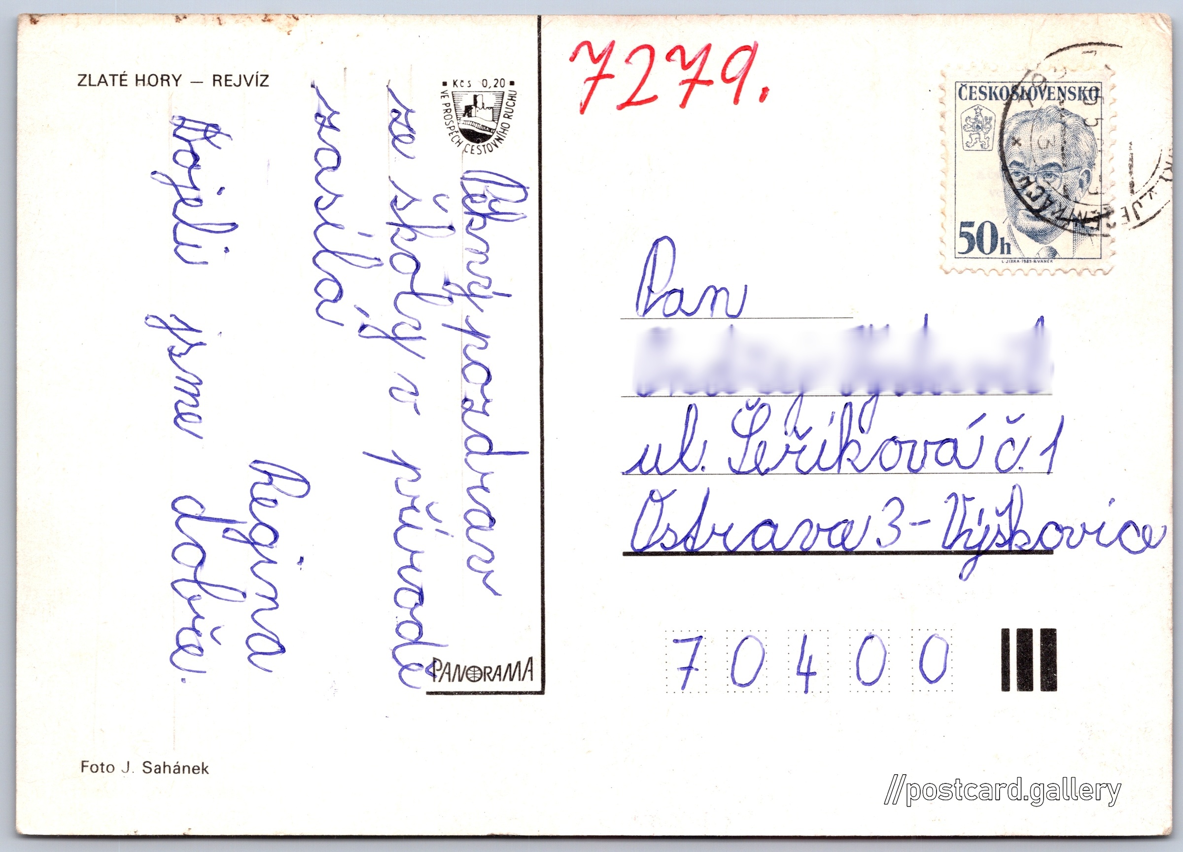 Zlaté Hory, Rejvíz Pokud chcete vidět pohlednice ve vyšším rozlišení nebo zobrazovat jejich zadní stranu, tak se prosím nejdříve přihlašte Log in Register Zlaté HoryRejvíz ZLATÉ HORY - REJVÍZ Language of printed text on postcard: Czech Penzion Rejvíz, Historická budova, Rejvíz 29, Zlaté Hory - Rejvíz, Česko show on map Publisher: Panorama (Czechoslovakia) Issue date of postcard is not known Help us estimate date of postcard publishing Postcard size (w x h) and shape: 148 x 105 mm (5.83" x 4.13"), rectangle Persons connected with this postcard: Jaromír Sahánek(Photo author) Used postcard Prices: Fee to support turism: 0,20 Kčs (CSK)Paid stamps: 0,50 Kčs (CSK) DiscussionAdd post Add new folder ... Manage folders ...