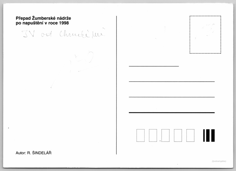Žumberk reservoir overflow Pokud chcete vidět pohlednice ve vyšším rozlišení nebo zobrazovat jejich zadní stranu, tak se prosím nejdříve přihlašte Log in Register Přepad Žumberské nádrže po napuštění v roce 1998 Language of printed text on postcard: Czech Žumberk, Žár, České Budějovice show on map Issue date of postcard is not known Help us estimate date of postcard publishing Postcard size (w x h) and shape: 147 x 106 mm (5.79" x 4.17"), rectangle Persons connected with this postcard: R. Šindelář(Photo author) Unused postcard DiscussionAdd post Add new folder ... Manage folders ...