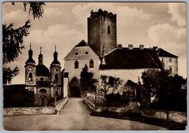Státní zámek VRANOV nad Dyjí Předhradí s gotickou věží (upraveno 1824) a kaplí N. Trojice ...