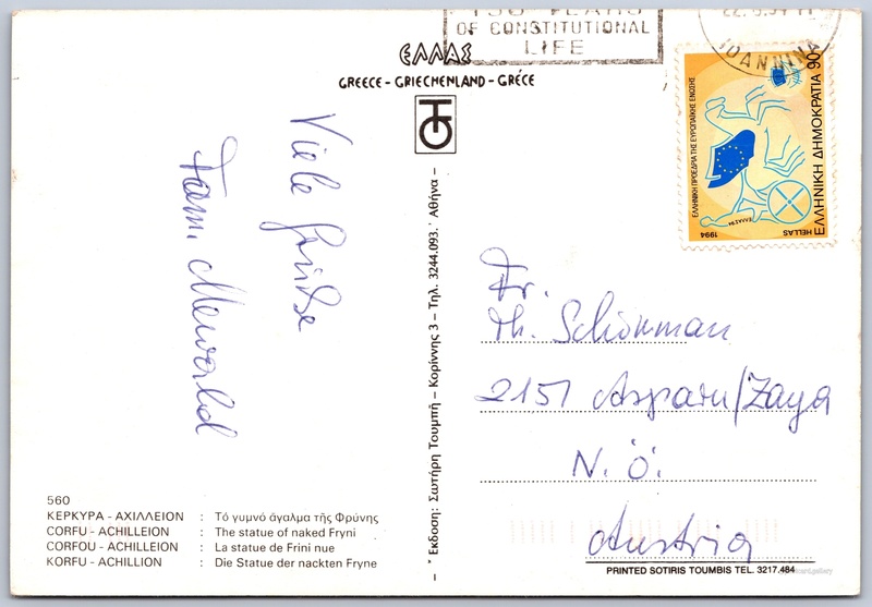 Achilleion, socha Fryné Pokud chcete vidět pohlednice ve vyšším rozlišení nebo zobrazovat jejich zadní stranu, tak se prosím nejdříve přihlašte Přihlásit Zaregistrovat ΚΕΡΚΥΡΑ - ΑΧΙΛΛΕΙΟΝ: Τό γυμνό ἄγαλμα τῆς ΦρύνηςCORFU - ACHILLEION: The statue of naked FryniCORFOU-ACHILLEION: La statue de Frini nueKORFU - ACHILLION: Die Statue der nackten Fryne Jazyk tištěného textu na pohlednici: řečtina Korfu (Κέρκυρα) ukázat na mapě Odhadované datum vydání pohlednice: 1992 - 1994 Pomozte nám zpřesnit rok vzniku pohlednice Velikost (š x v) a tvar pohlednice: 147 x 100 mm (5.79" x 3.94"), obdélník Prošlá poštou Ceny: Vyplacené známky: 90 ₯ (GRD) DiskuseVložit příspěvek Přidat novou složku ... Spravovat složky ...