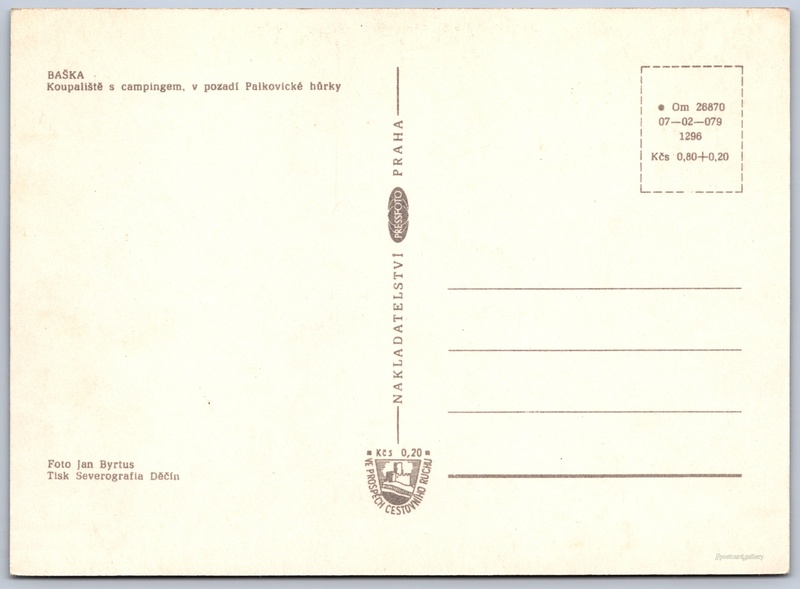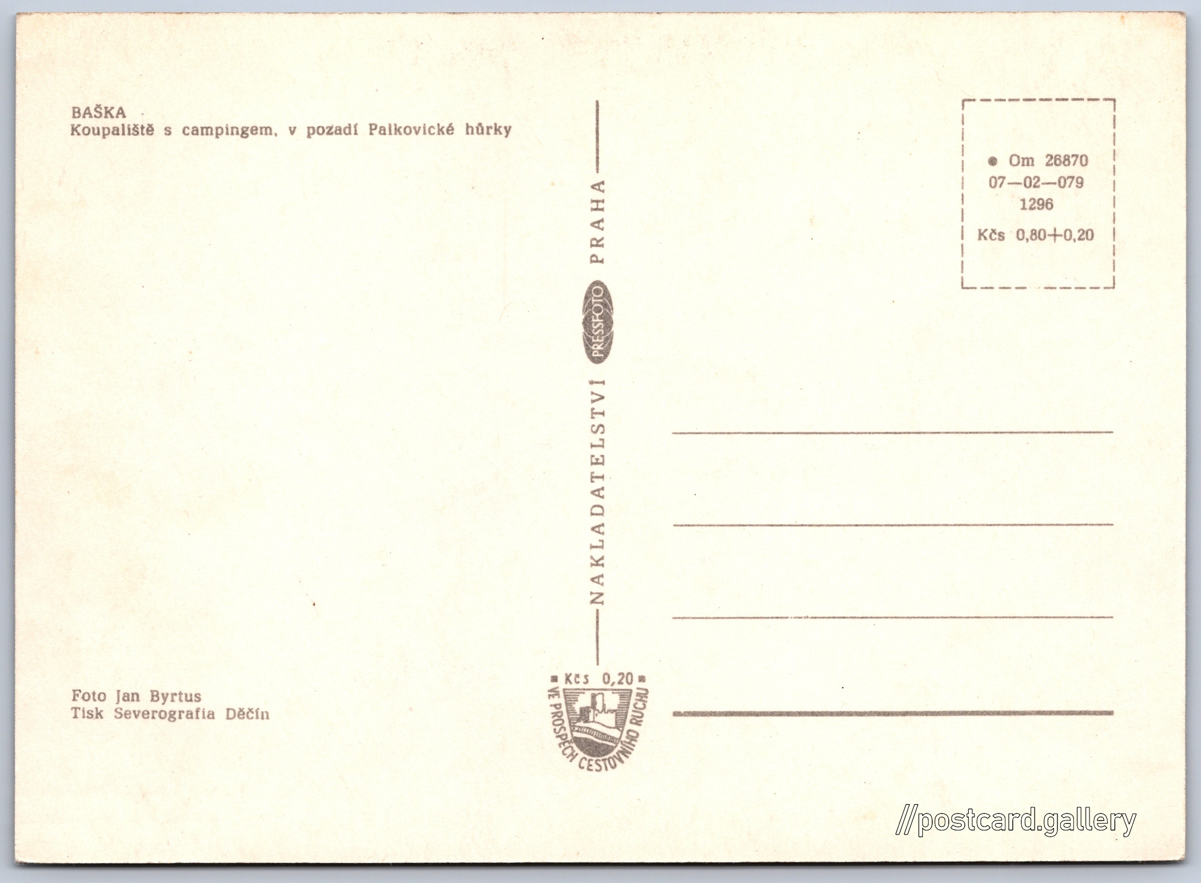 Baška, koupaliště Pokud chcete vidět pohlednice ve vyšším rozlišení nebo zobrazovat jejich zadní stranu, tak se prosím nejdříve přihlašte Přihlásit Zaregistrovat BAŠKAKoupaliště s campingem, v pozadí Palkovické hůrky Jazyk tištěného textu na pohlednici: čeština Autokemp Baška, Baška, Baška, Česko ukázat na mapě V blízkém okolí místa zobrazeného na pohlednici lze najít 4 jiné pohlednice. Zobrazit blízké pohlednice Vydavatel: PressFoto Praha (Československo) Rok vydání pohlednice: 1970 Velikost (š x v) a tvar pohlednice: 143 x 104 mm (5.63" x 4.09"), obdélník Osoby spjaté s touto pohlednicí: Jan Byrtus(Autor fotografie) Čistá pohlednice (neprošlá poštou) Ceny: Cena pohlednice: 0,80 Kčs (CSK) (+0,20 Kčs přípl. na tur. ruch) Kódy na pohlednici: •Om 26870 07-02-079 1296 DiskuseVložit příspěvek Přidat novou složku ... Spravovat složky ...