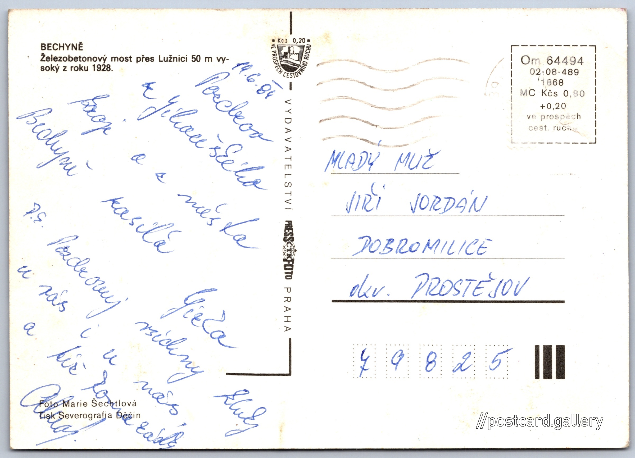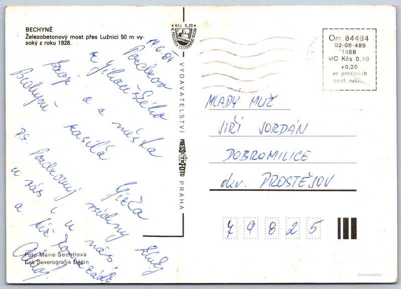 Bechyně, železobetonový most přes Lužnici Pokud chcete vidět pohlednice ve vyšším rozlišení nebo zobrazovat jejich zadní stranu, tak se prosím nejdříve přihlašte Přihlásit Zaregistrovat BECHYNĚŽelezobetonový most přes Lužnici 50 m vysoký z roku 1928. Jazyk tištěného textu na pohlednici: čeština Lužnice, km 11,9 - most Duha, Most, Sudoměřice u Bechyně - Bežerovice, Česko ukázat na mapě V blízkém okolí místa zobrazeného na pohlednici lze najít 7 jiných pohlednic. Zobrazit blízké pohlednice Vydavatel: PressFoto Praha (Československo) Rok vydání pohlednice: 1984 Velikost (š x v) a tvar pohlednice: 147 x 105 mm (5.79" x 4.13"), obdélník Osoby spjaté s touto pohlednicí: Marie Šechtlová(Autor fotografie) Prošlá poštou:Datum napsání pohledu: 19.6.1984 Ceny: Cena pohlednice: 0,80 Kčs (CSK) (+0,20 Kčs přípl. na tur. ruch) Kódy na pohlednici: Om 64494 02-08-489 1868 DiskuseVložit příspěvek Přidat novou složku ... Spravovat složky ...