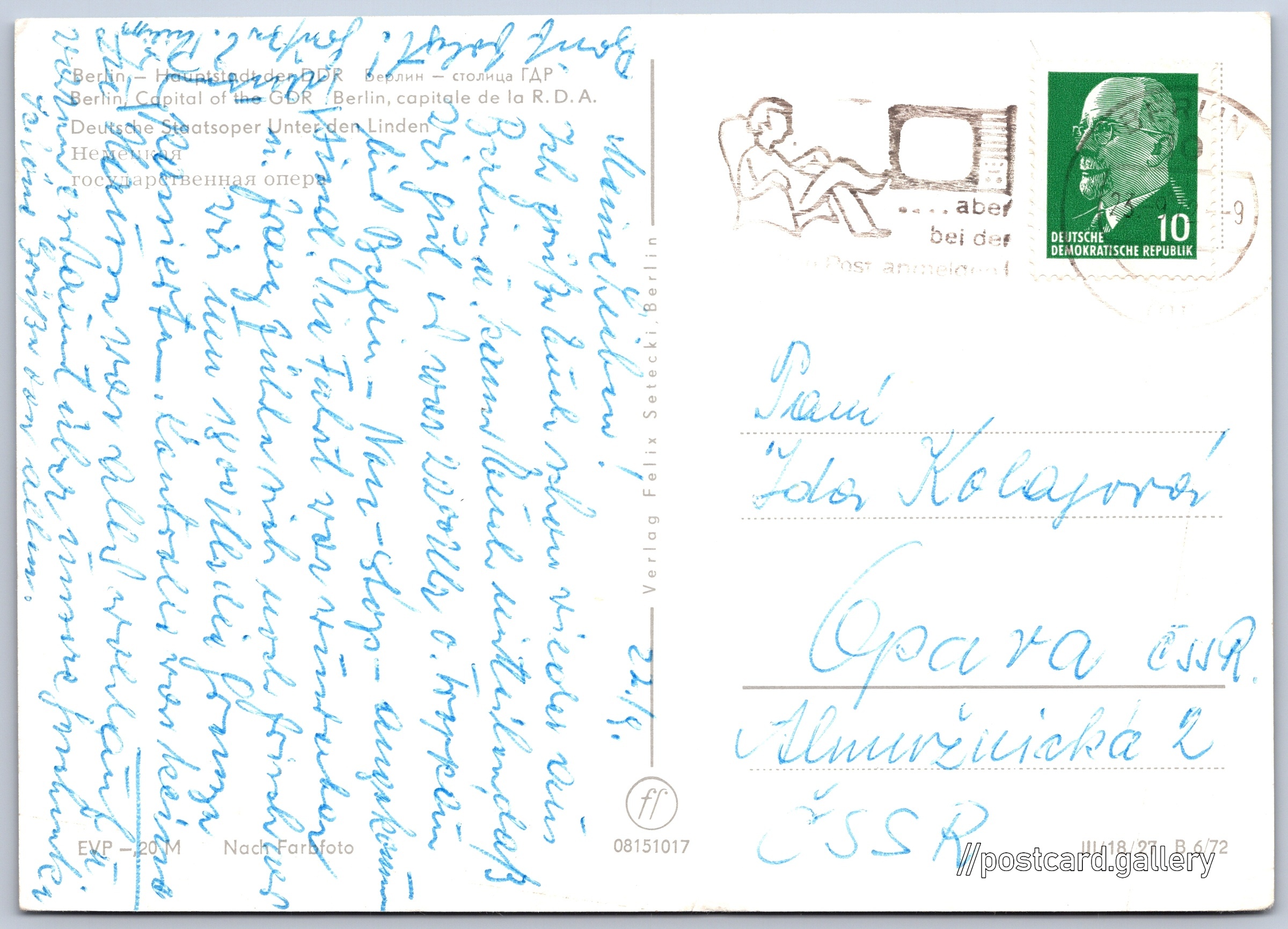 Berlín, státní opera Pokud chcete vidět pohlednice ve vyšším rozlišení nebo zobrazovat jejich zadní stranu, tak se prosím nejdříve přihlašte Přihlásit Zaregistrovat Berlin - Haupstadt der DDRBerlin - Capital of the GDRBerlin, capitale de la R.D.A.Deutsche Staatsoper Unter den Linden Jazyky tištěného textu na pohlednici: němčina, ruština, angličtina, francouzština Berlínská státní opera, Unter den Linden 7, Berlín - Mitte, Německo ukázat na mapě V blízkém okolí místa zobrazeného na pohlednici lze najít 4 jiné pohlednice. Zobrazit blízké pohlednice Vydavatel: Felix Setecki (Německo) Rok vydání pohlednice: 1972 Velikost (š x v) a tvar pohlednice: 147 x 105 mm (5.79" x 4.13"), obdélník Prošlá poštou:Datum na razítku: 23.9.1972Datum napsání pohledu: 22.9.1972 Ceny: Cena pohlednice: 0,20 M (MDN)Vyplacené známky: 0,10 M (MDN) Kódy na pohlednici: III/18/27 B 6/72 08151017 DiskuseVložit příspěvek Přidat novou složku ... Spravovat složky ...