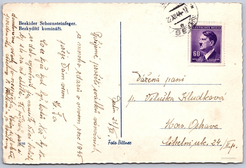 Beskydští komináři Pokud chcete vidět pohlednice ve vyšším rozlišení nebo zobrazovat jejich zadní stranu, tak se prosím nejdříve přihlašte Přihlásit Zaregistrovat Beskider Schornsteinfeger.Bezkydští komináři. Jazyk tištěného textu na pohlednici: čeština Vydavatel: Foto Bittner (Československo) Odhadované datum vydání pohlednice: 1941 - 1944 Pomozte nám zpřesnit rok vzniku pohlednice Velikost (š x v) a tvar pohlednice: 138 x 93 mm (5.43" x 3.66"), obdélník, zoubkovaný Prošlá poštou:Datum na razítku: 22.11.1944Datum napsání pohledu: 21.12.1944 Ceny: Vyplacené známky: 0,60 ℛℳ (RM) Kódy na pohlednici: 198 DiskuseVložit příspěvek Přidat novou složku ... Spravovat složky ...