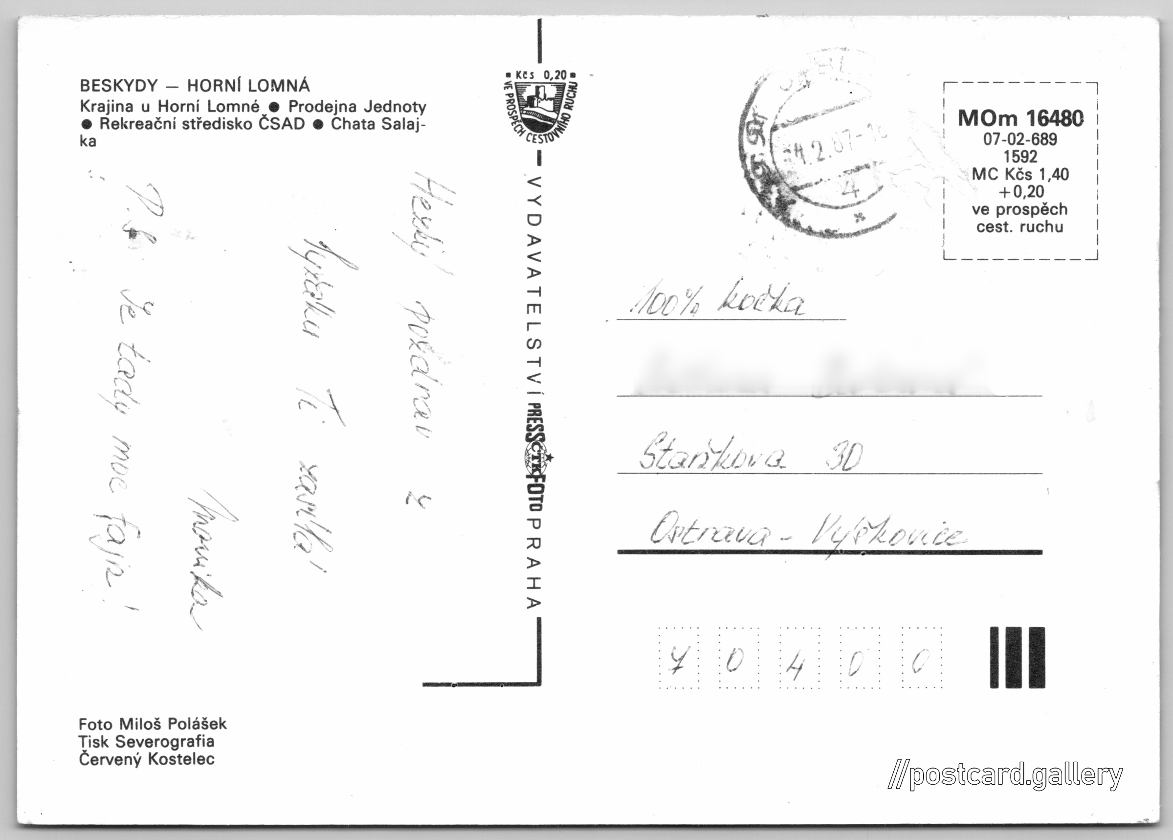 Beskydy, Horní Lomná Pokud chcete vidět pohlednice ve vyšším rozlišení nebo zobrazovat jejich zadní stranu, tak se prosím nejdříve přihlašte Přihlásit Zaregistrovat Horní Lomná BESKYDY - HORNÍ LOMNÁ- Krajina u Horní Lomné- Prodejna Jednoty- Rekreační středisko ČSAD- Chata Salajka Jazyk tištěného textu na pohlednici: čeština Horní Lomná, Frýdek-Místek ukázat na mapě Přesné místo není známo. Pokud jej znáte, tak jej prosím napište do komentářů nebo označte na mapě Vydavatel: PressFoto Praha (Československo) Rok vydání pohlednice: 1986 Velikost (š x v) a tvar pohlednice: 148 x 105 mm (5.83" x 4.13"), obdélník Osoby spjaté s touto pohlednicí: Miloš Polášek(Autor fotografie) Prošlá poštou:Datum na razítku: 24.2.1987 Ceny: Cena pohlednice: 1,40 Kčs (CSK) (+0,20 Kčs přípl. na tur. ruch) Kódy na pohlednici: MOm 16480 07-02-689 1592 DiskuseVložit příspěvek Přidat novou složku ... Spravovat složky ...