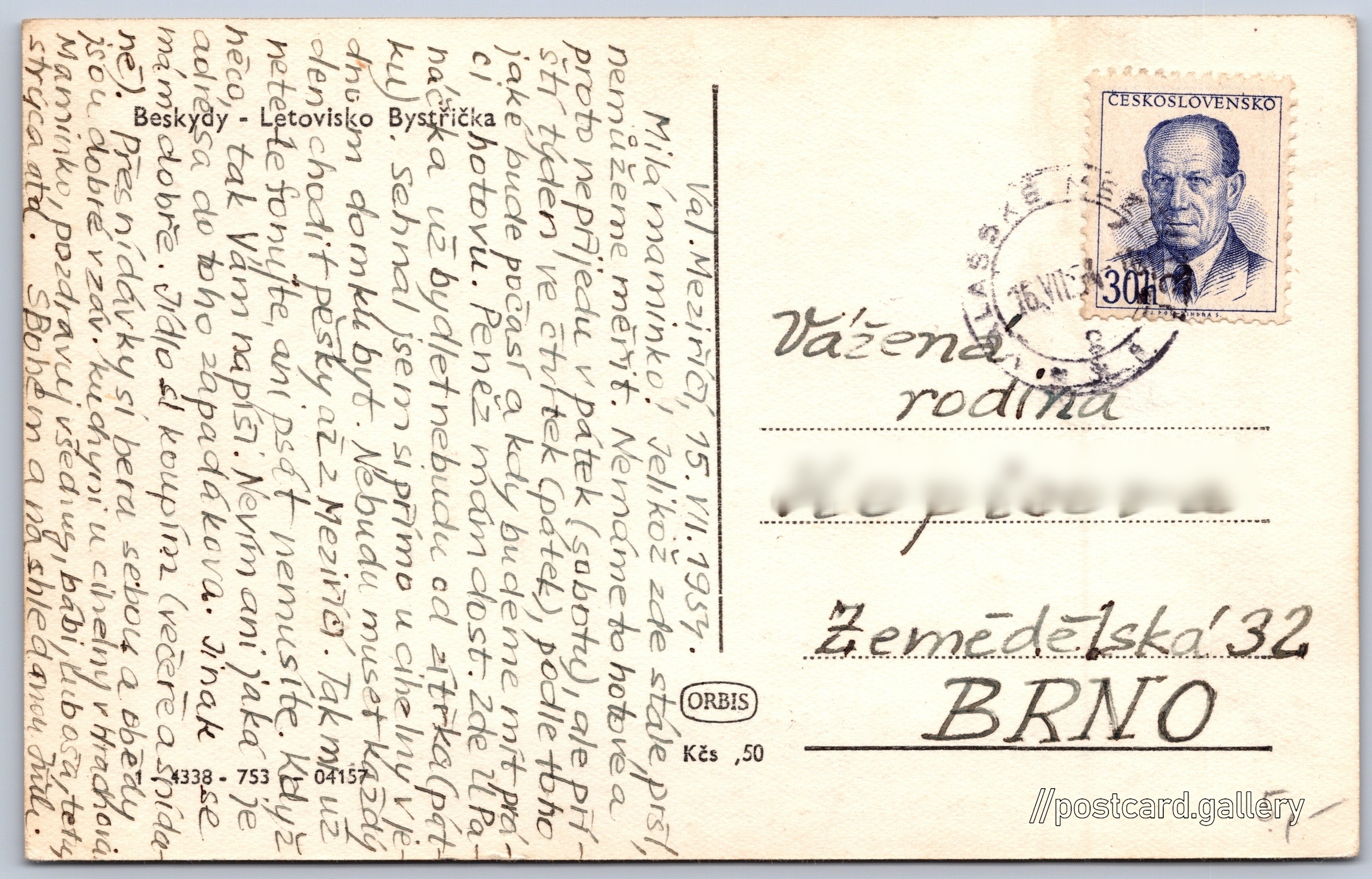 Beskydy, letovisko Bystřička Pokud chcete vidět pohlednice ve vyšším rozlišení nebo zobrazovat jejich zadní stranu, tak se prosím nejdříve přihlašte Přihlásit Zaregistrovat Beskydy - Letovisko Bystřička Jazyk tištěného textu na pohlednici: čeština Bystřička, Vsetín ukázat na mapě Vydavatel: Nakladatelství Orbis (Československo) Rok vydání pohlednice: červenec, 1953 Velikost (š x v) a tvar pohlednice: 140 x 89 mm (5.51" x 3.50"), obdélník Prošlá poštou:Datum na razítku: 16.7.1954Datum napsání pohledu: 15.7.1954 Ceny: Cena pohlednice: 0,50 Kčs (CSK)Vyplacené známky: 0,30 Kčs (CSK) Kódy na pohlednici: 1-4338-753 04157 DiskuseVložit příspěvek Přidat novou složku ... Spravovat složky ...
