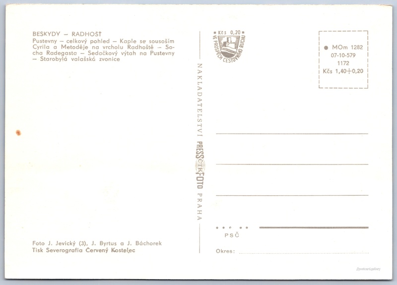 Beskydy, Radhošť Pokud chcete vidět pohlednice ve vyšším rozlišení nebo zobrazovat jejich zadní stranu, tak se prosím nejdříve přihlašte Přihlásit Zaregistrovat BeskydyRadhošť BESKYDY - RADHOŠŤ- Pustevny - celkový pohled- Kaple se sousoším Cyrila a Metoděje na vrcholu Radhoště- Socha Radegasta- Sedačkový výtah na Pustevny- Starobylá valašská zvonice Jazyk tištěného textu na pohlednici: čeština Pustevny, Místní název, osada, Prostřední Bečva, Česko ukázat na mapě V blízkém okolí místa zobrazeného na pohlednici lze najít 32 jiných pohlednic. Zobrazit blízké pohlednice Vydavatel: PressFoto Praha (Československo) Rok vydání pohlednice: 1975 Velikost (š x v) a tvar pohlednice: 147 x 105 mm (5.79" x 4.13"), obdélník Osoby spjaté s touto pohlednicí: Jan Jevický(Autor fotografie) Jan Byrtus(Autor fotografie) J. Báchorek(Autor fotografie) Čistá pohlednice (neprošlá poštou) Ceny: Cena pohlednice: 1,40 Kčs (CSK) (+0,20 Kčs přípl. na tur. ruch) Kódy na pohlednici: MOm 1282 07-10-579 1172 DiskuseVložit příspěvek Přidat novou složku ... Spravovat složky ...