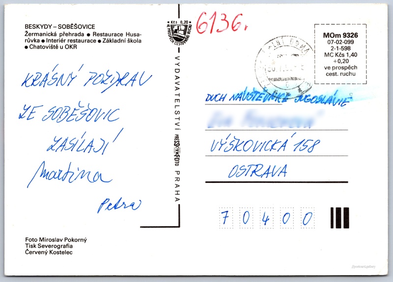Beskydy, Soběšovice Pokud chcete vidět pohlednice ve vyšším rozlišení nebo zobrazovat jejich zadní stranu, tak se prosím nejdříve přihlašte Přihlásit Zaregistrovat Soběšovice BESKYDY - SOBĚŠOVICE- Žermanická přehrada- Restaurace Husarůvka- Interiér restaurace- Základní škola- Chatoviště u OKR Jazyk tištěného textu na pohlednici: čeština Lučina, Frýdek-Místek ukázat na mapě Vydavatel: PressFoto Praha (Československo) Rok vydání pohlednice: 1990 Velikost (š x v) a tvar pohlednice: 148 x 105 mm (5.83" x 4.13"), obdélník Osoby spjaté s touto pohlednicí: Miroslav Pokorný(Autor fotografie) Prošlá poštou Ceny: Cena pohlednice: 1,40 Kčs (CSK) (+0,20 Kčs přípl. na tur. ruch) Kódy na pohlednici: MOm 9326 07-02-099 2-1-598 DiskuseVložit příspěvek Přidat novou složku ... Spravovat složky ...