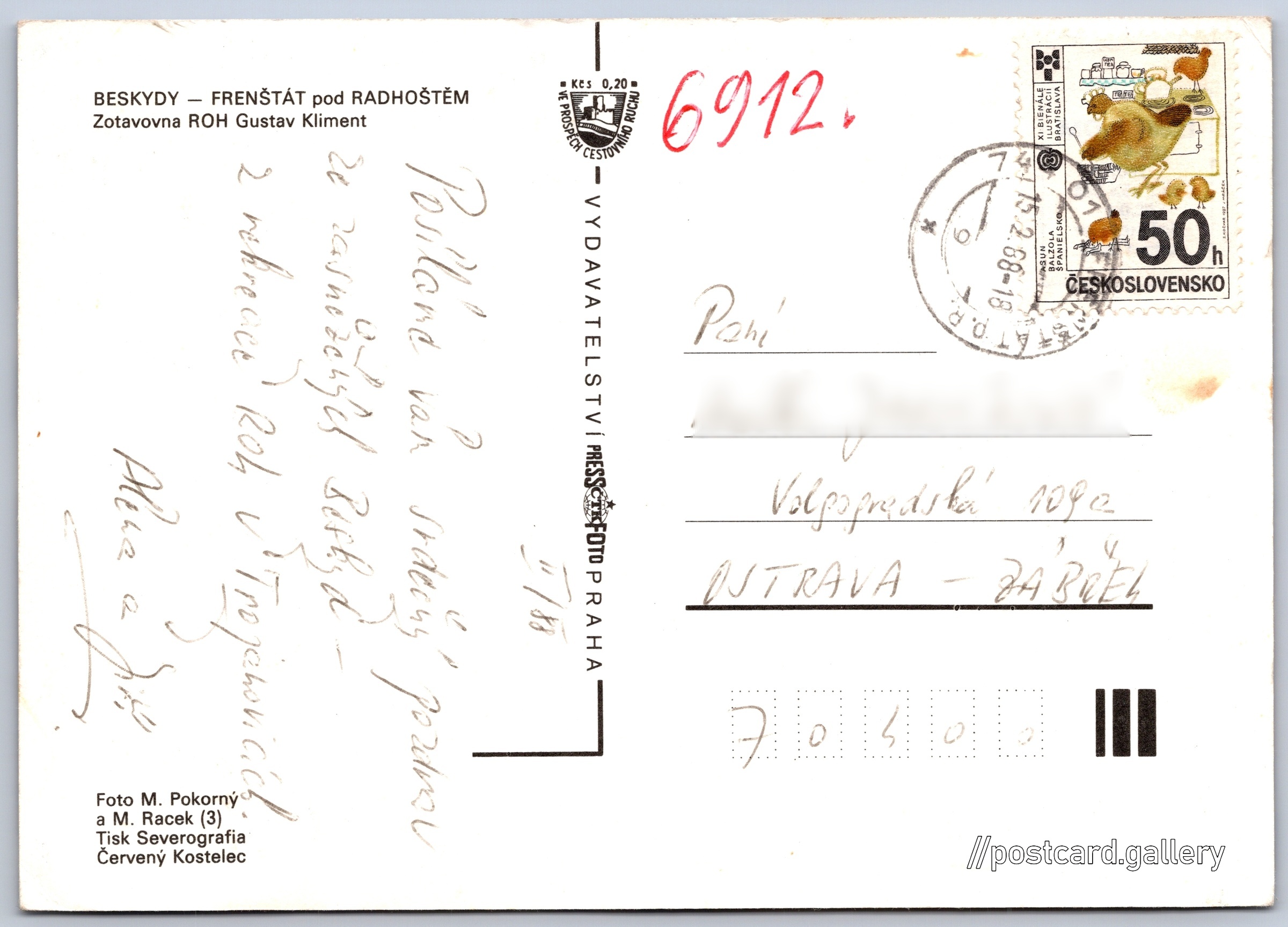 Beskydy, zotavovna Gustav Kliment Pokud chcete vidět pohlednice ve vyšším rozlišení nebo zobrazovat jejich zadní stranu, tak se prosím nejdříve přihlašte Přihlásit Zaregistrovat Beskydy - zotavovna ROH Gustav Kliment BESKYDY - FRENŠTÁT pod RADHOŠTĚMZotavovna ROH Gustav Kliment Jazyk tištěného textu na pohlednici: čeština Trojanovice 388, Trojanovice, 744 01, Nový Jičín ukázat na mapě Vydavatel: PressFoto Praha (Československo) Odhadované datum vydání pohlednice: 1985 - 1988 Pomozte nám zpřesnit rok vzniku pohlednice Velikost (š x v) a tvar pohlednice: 148 x 105 mm (5.83" x 4.13"), obdélník Osoby spjaté s touto pohlednicí: Miroslav Pokorný(Autor fotografie) Gustav Kliment(Obsah pohlednice) Milan Racek(Autor fotografie) Prošlá poštou:Datum na razítku: 15.2.1988 Ceny: Příplatek na tur. ruch: 0,20 Kčs (CSK))Vyplacené známky: 0,50 Kčs (CSK) DiskuseVložit příspěvek Přidat novou složku ... Spravovat složky ...
