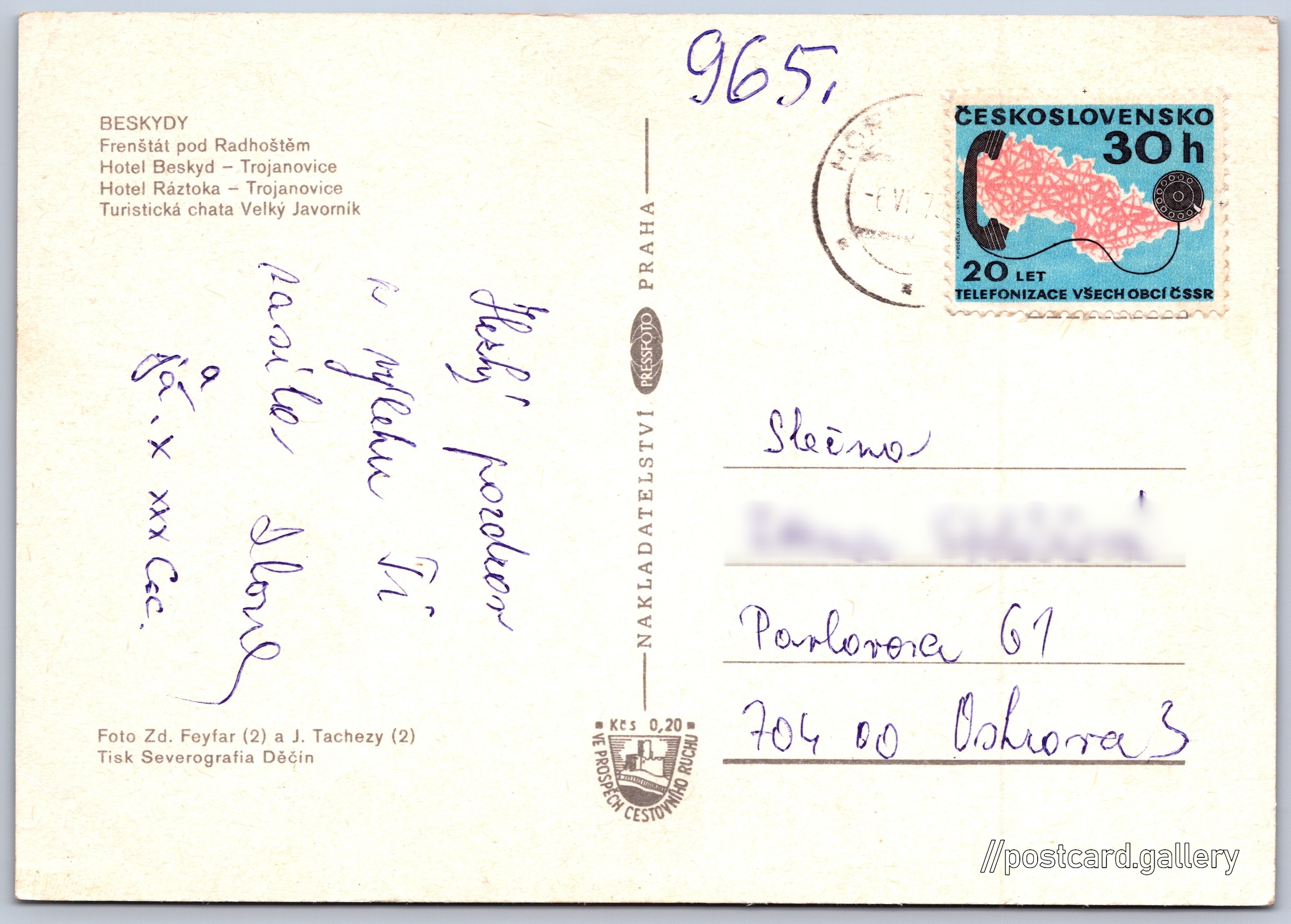 Beskydy Pokud chcete vidět pohlednice ve vyšším rozlišení nebo zobrazovat jejich zadní stranu, tak se prosím nejdříve přihlašte Přihlásit Zaregistrovat Restaurace Nový Jičín BESKYDY- Frenštát pod Radhoštěm- Hotel Beskyd - Trojanovice- Hotel Ráztoka - Trojanovice- Turistická chata Velký Javorník Jazyk tištěného textu na pohlednici: čeština Frenštát pod Radhoštěm, Město, Česko ukázat na mapě Vydavatel: PressFoto Praha (Československo) Odhadované datum vydání pohlednice: 1970 - 1973 Pomozte nám zpřesnit rok vzniku pohlednice Velikost (š x v) a tvar pohlednice: 148 x 104 mm (5.83" x 4.09"), obdélník Osoby spjaté s touto pohlednicí: Jan Tachezy(Autor fotografie) Zdenko Feyfar(Autor fotografie) Prošlá poštou:Datum na razítku: 6.6.1973 Ceny: Příplatek na tur. ruch: 0,20 Kčs (CSK))Vyplacené známky: 0,30 Kčs (CSK) DiskuseVložit příspěvek Přidat novou složku ... Spravovat složky ...