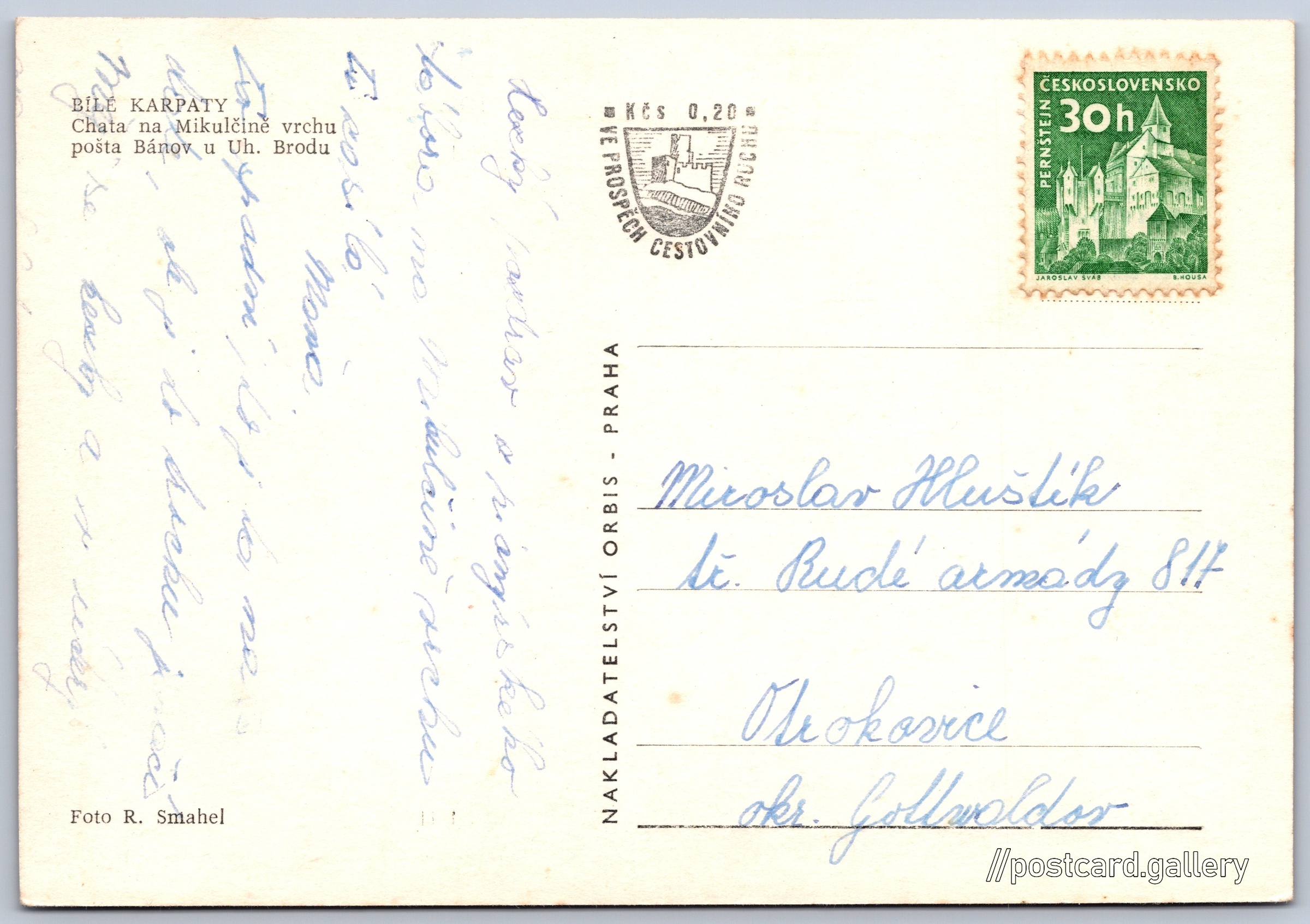 Bílé Karpaty, chata na Mikulčině vrchu Pokud chcete vidět pohlednice ve vyšším rozlišení nebo zobrazovat jejich zadní stranu, tak se prosím nejdříve přihlašte Přihlásit Zaregistrovat BÍLÉ KARPATYChata na Mikulčině vrchupošta Bánov u Uh. Brodu Jazyk tištěného textu na pohlednici: čeština Penzion Patrik Mikulčin Vrch, Vápenice 65, Vápenice, Česko ukázat na mapě V blízkém okolí místa zobrazeného na pohlednici lze najít 1 jinou pohlednici. Zobrazit blízké pohlednice Vydavatel: Nakladatelství Orbis (Československo) Datum vydání není známo Pomozte nám odhadnout datum vzniku pohlednice Velikost (š x v) a tvar pohlednice: 142 x 98 mm (5.59" x 3.86"), obdélník Osoby spjaté s touto pohlednicí: R. Smahel(Autor fotografie) Prošlá poštou Ceny: Příplatek na tur. ruch: 0,20 Kčs (CSK))Vyplacené známky: 0,30 Kčs (CSK) DiskuseVložit příspěvek Přidat novou složku ... Spravovat složky ...